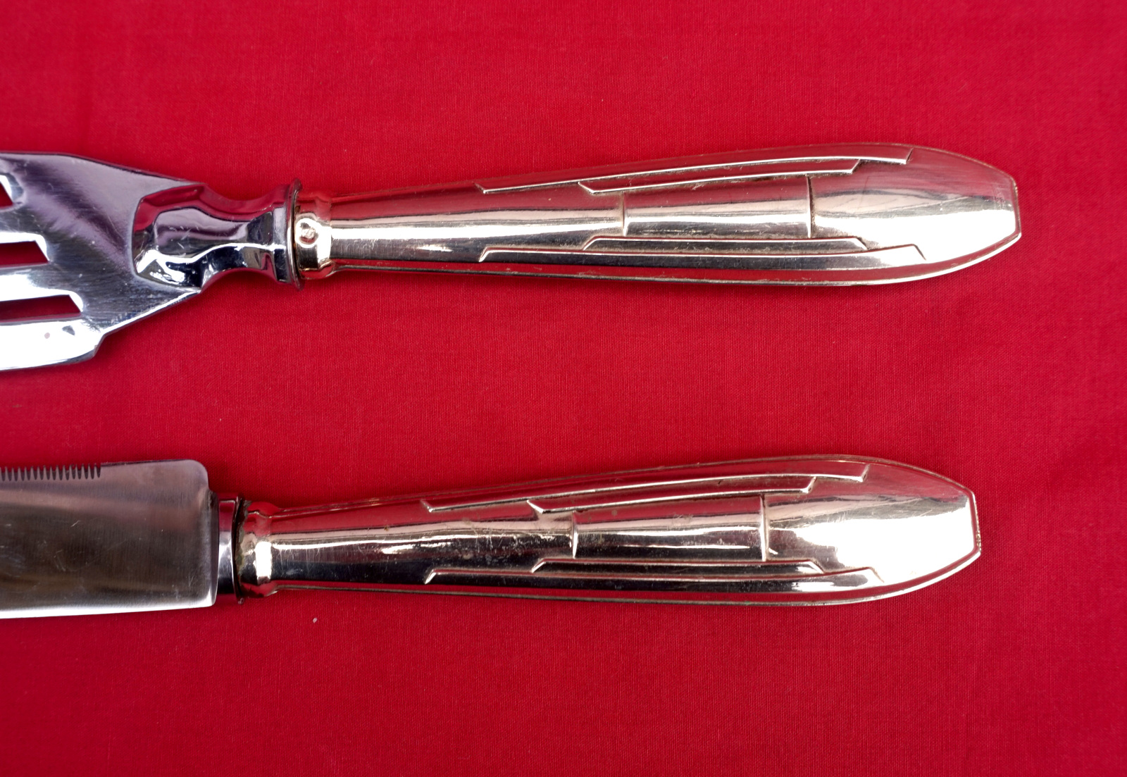 Ensemble couteau à pain, lame inox, et pelle à gateaux en métal argenté de style Art Déco vers 1940. Ils sont poinçonnés de l'orfèvre. Longueur du couteau 26.2 cm, de la pelle à gateaux 29.2 cm. Très bel état.