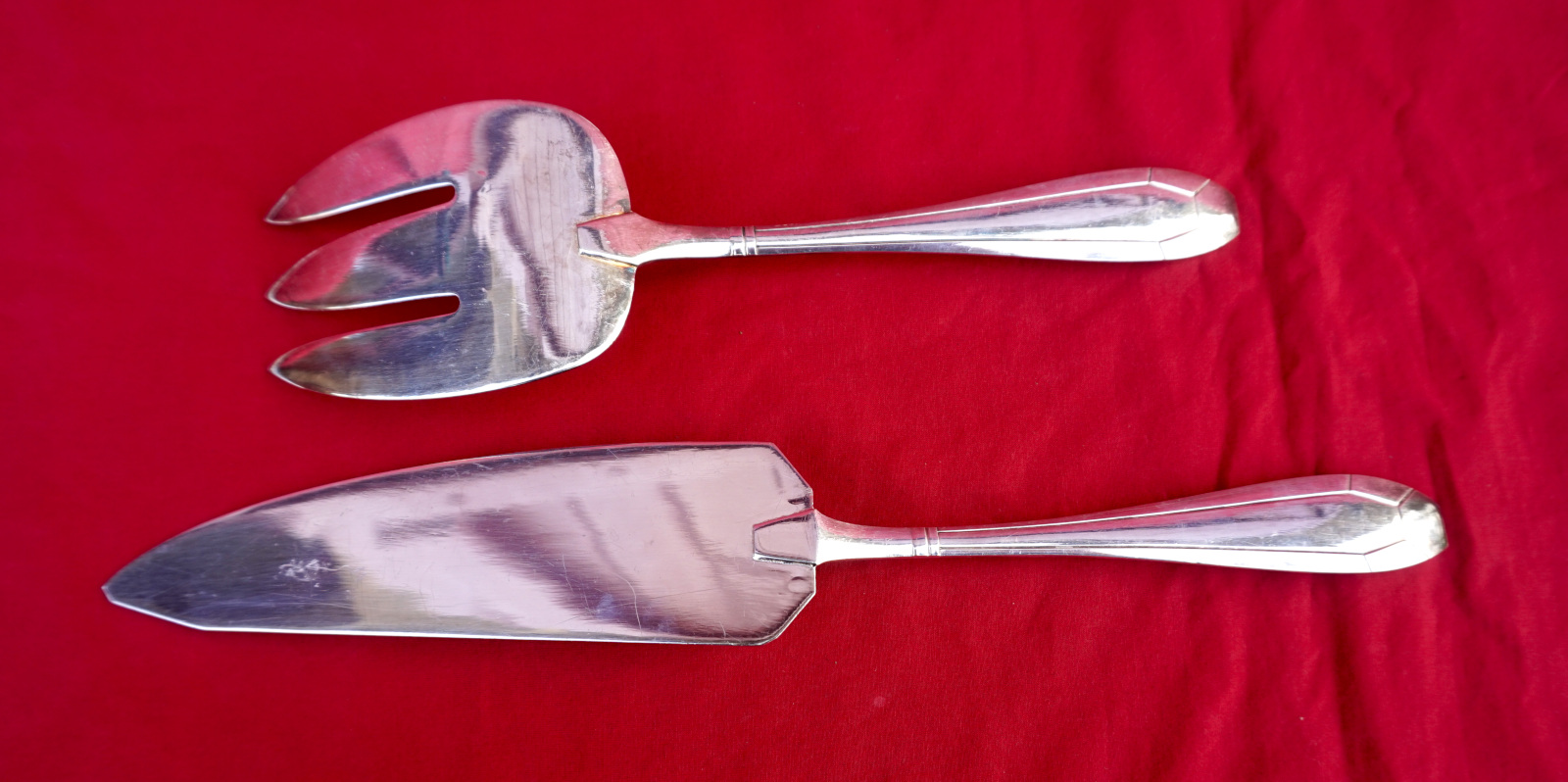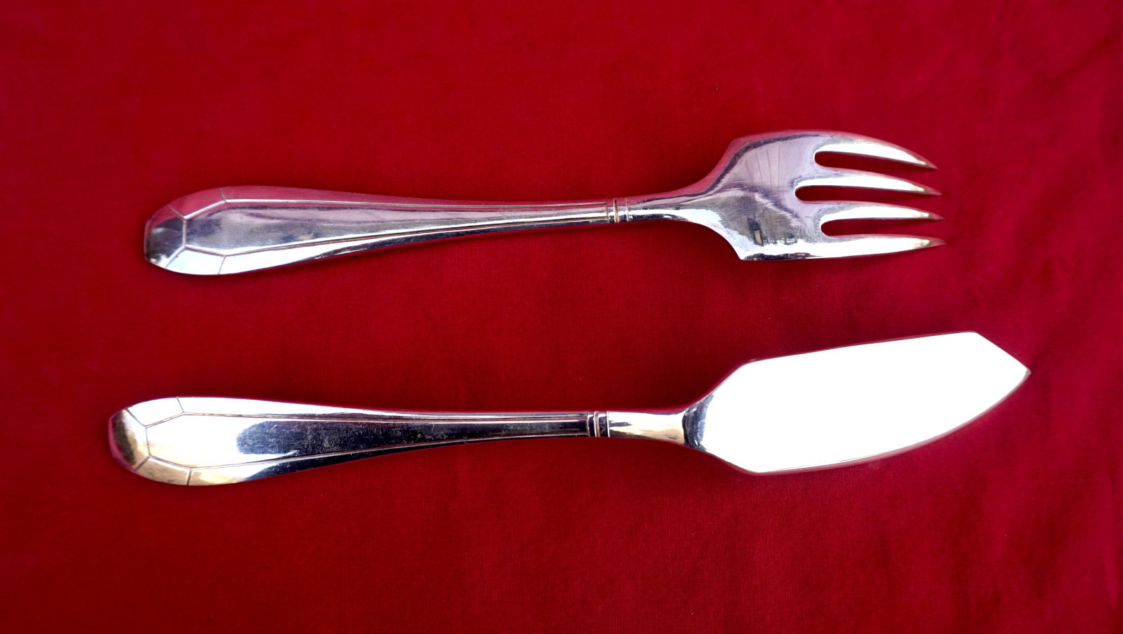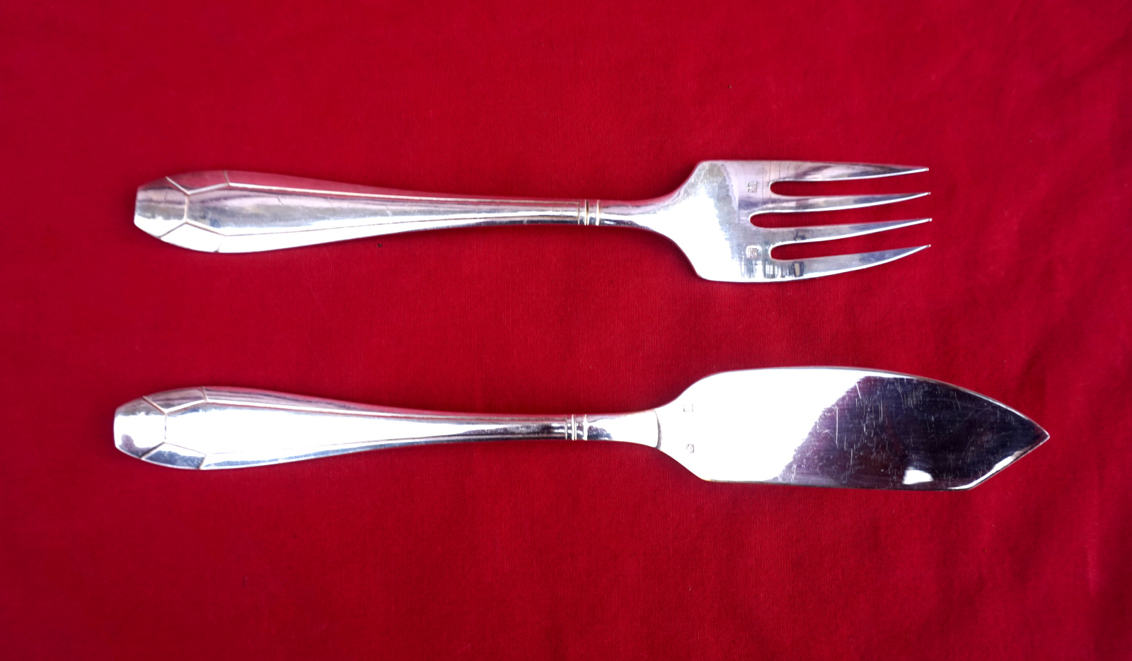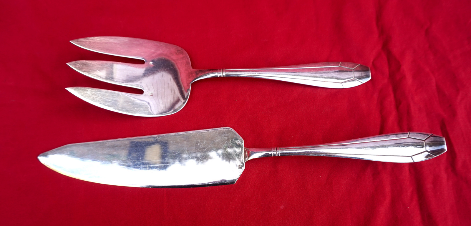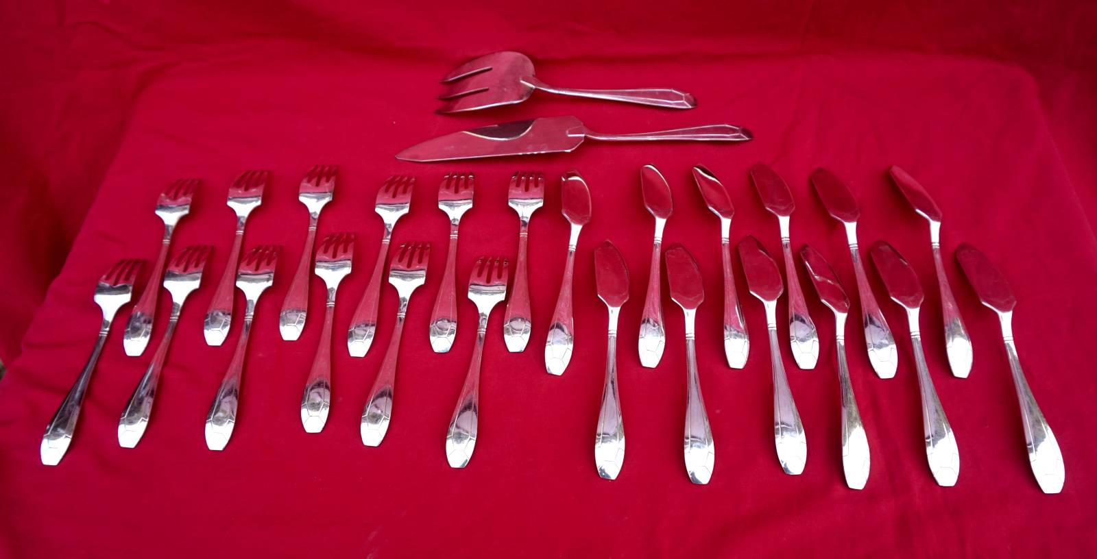 Service à poisson de style Art Déco par la maison Orbrille vers 1930. L'ensemble comprend 2 couverts de service et 12 couteaux et fourchettes. Dimensions: pour le couteau de service : longueur 30.5 cm, pour la fourche 23 cm, pour les couteaux longueur 19.8 cm, pour les fourchettes 17.8 cm. Très bel état, beau brilliant.