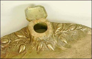 This inkwell with pine cones pattern in solid brass made by Rene Gardille goldsmith sculptor of Nancy school around 1925 Art Deco period. Good condition signed on the back only the glass inkwell is missing. 10"1/2 length 3"3/4 width 2"3/8 tall