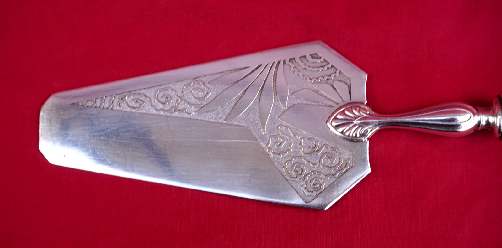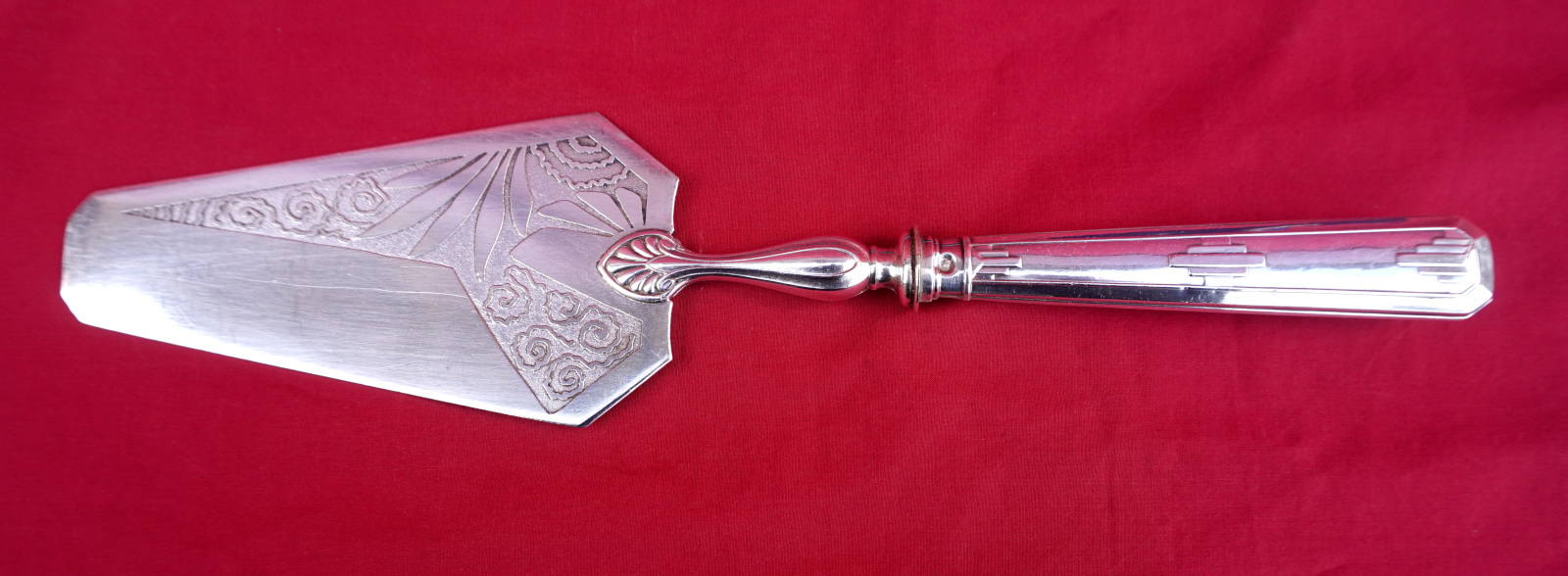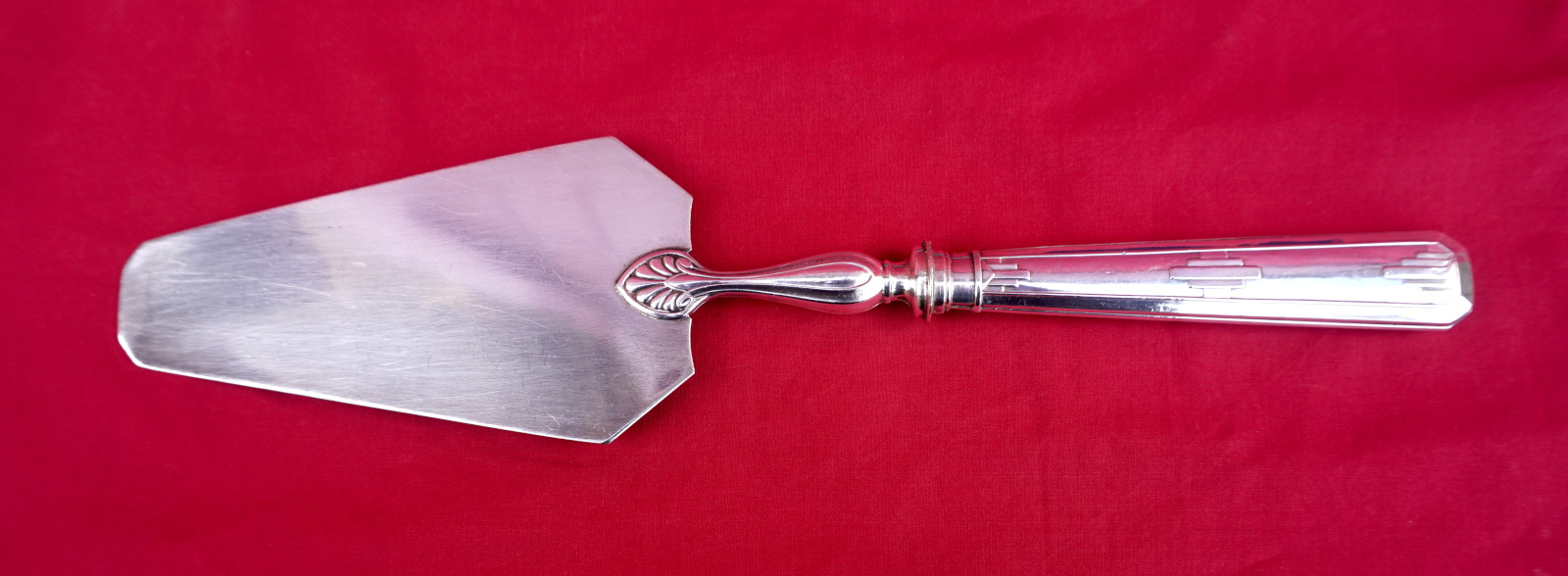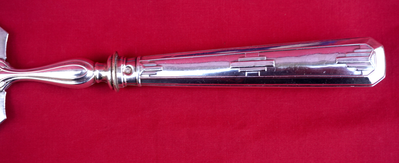 French Art Deco pie cake server with hollow sterling silver handle made during the 1930's. It's hallmarked with the head of Minerva, french sterling silver (.925) guarantee. 11 3/8" (29cm) length. Perfect condition as mint.