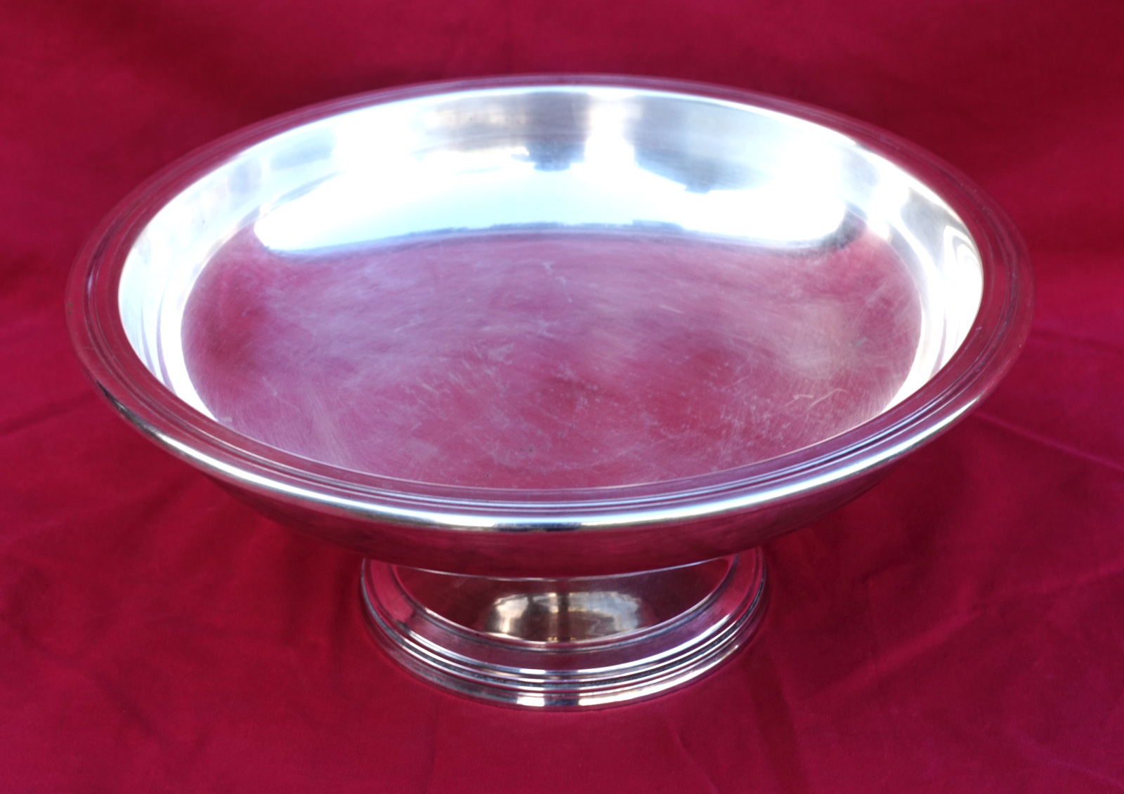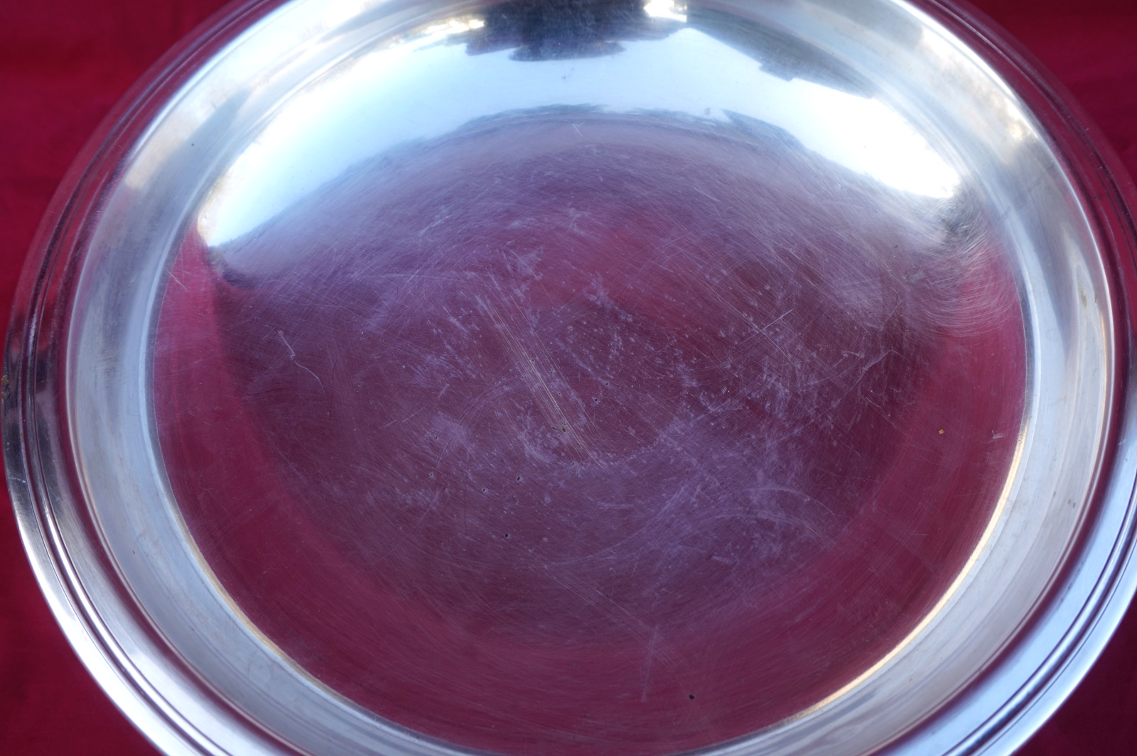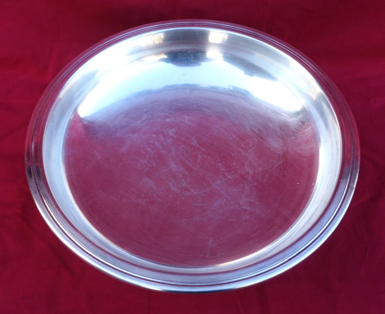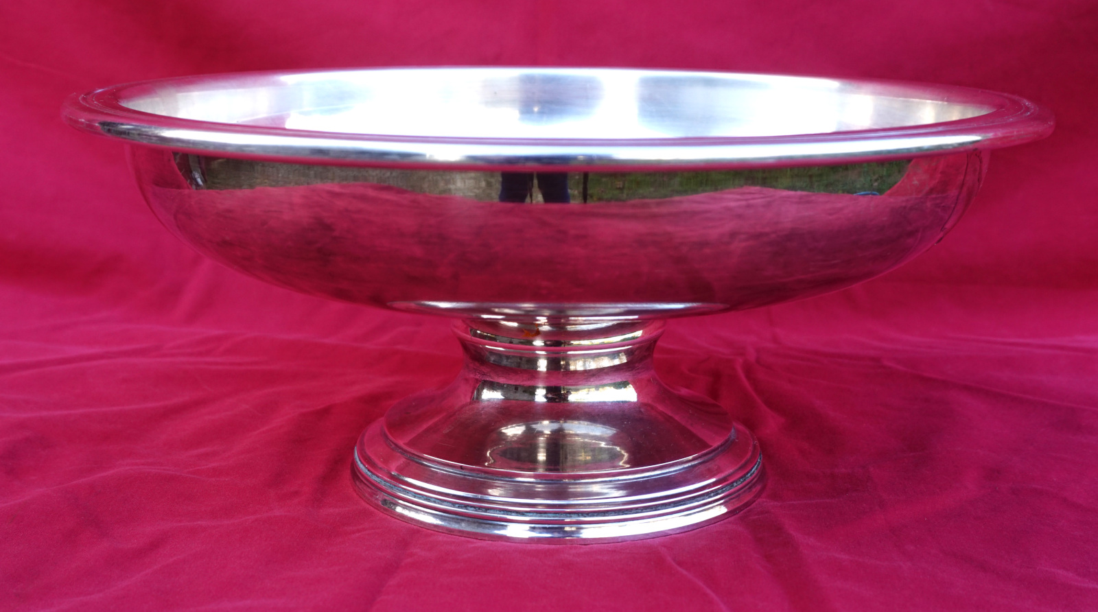 French Art Deco silverplate footed display bowl made during the 1930's. It's hallmarked on the back. 12 3/8" (31.5cm) diameter, 5 1/8" (13cm) height. Good condition slightly used in the bowl.