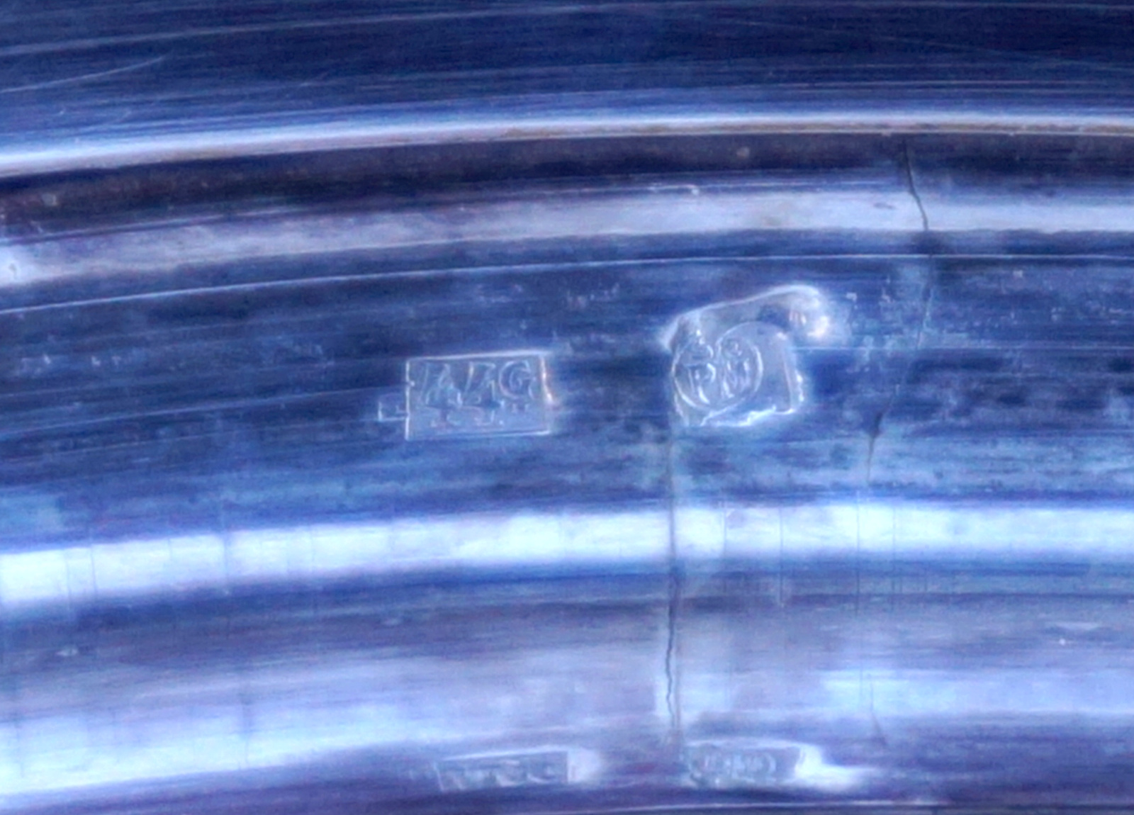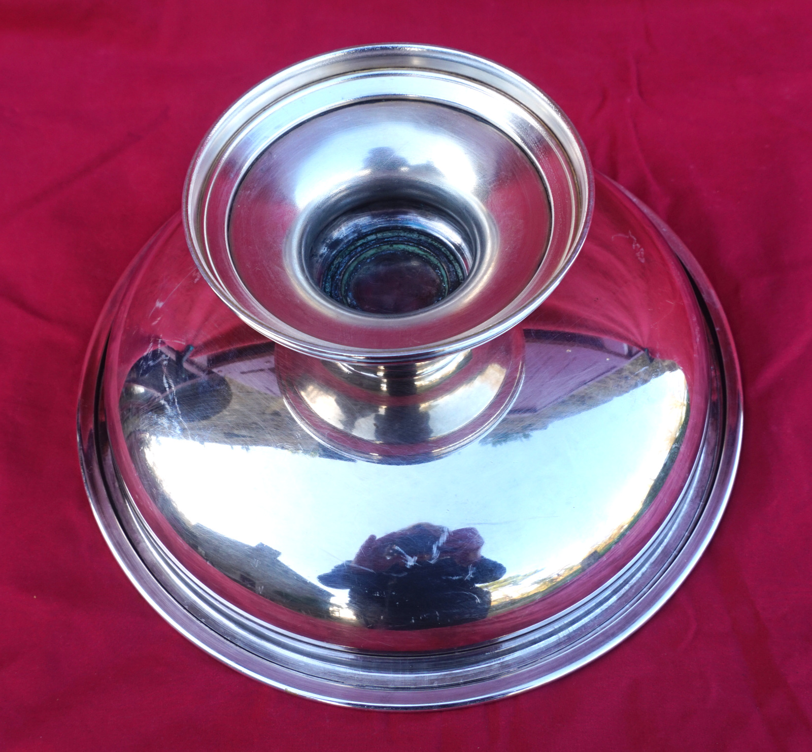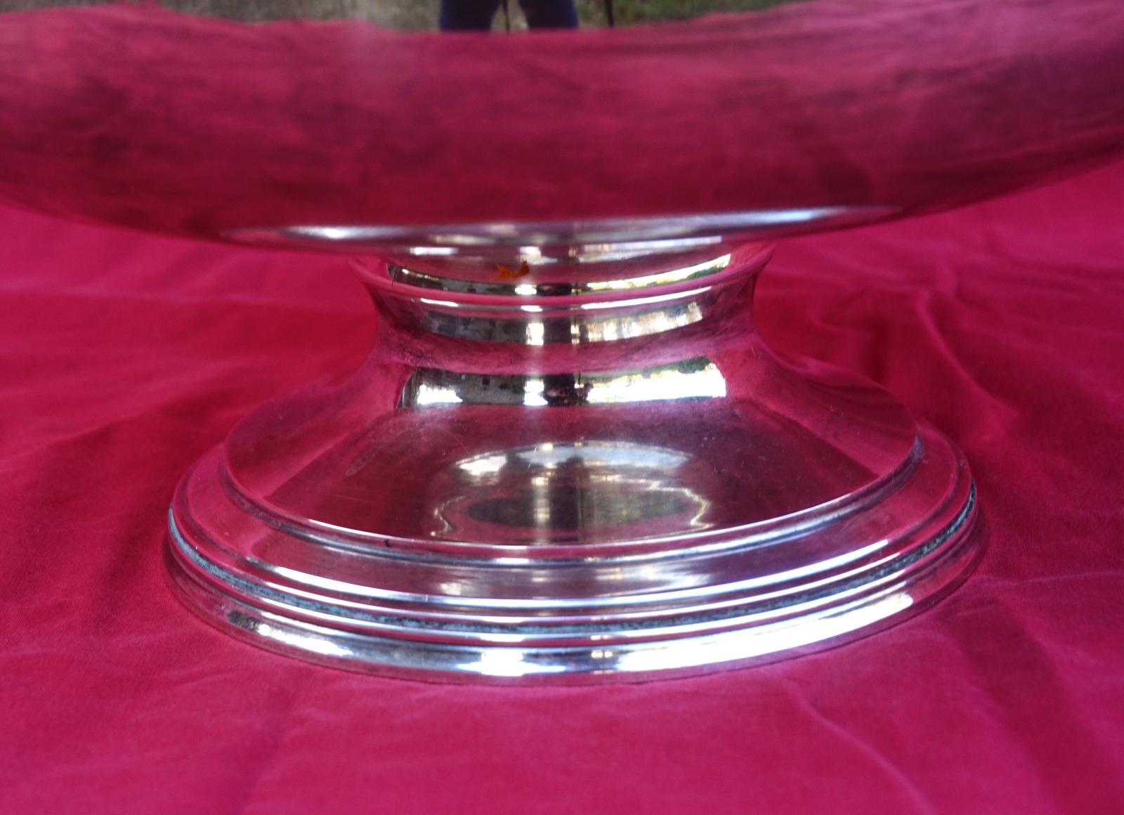 Grand coupe sur pied en métal argenté, vers 1930 période Art Deco. Elle est poinçonnée d'une marque d'orfève. Diamètre 31.5 cm, hauteur 13 cm. Bel état, quelques usures dans le fond.