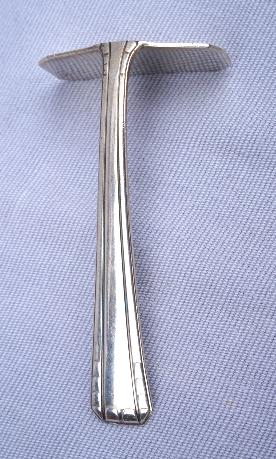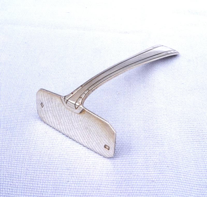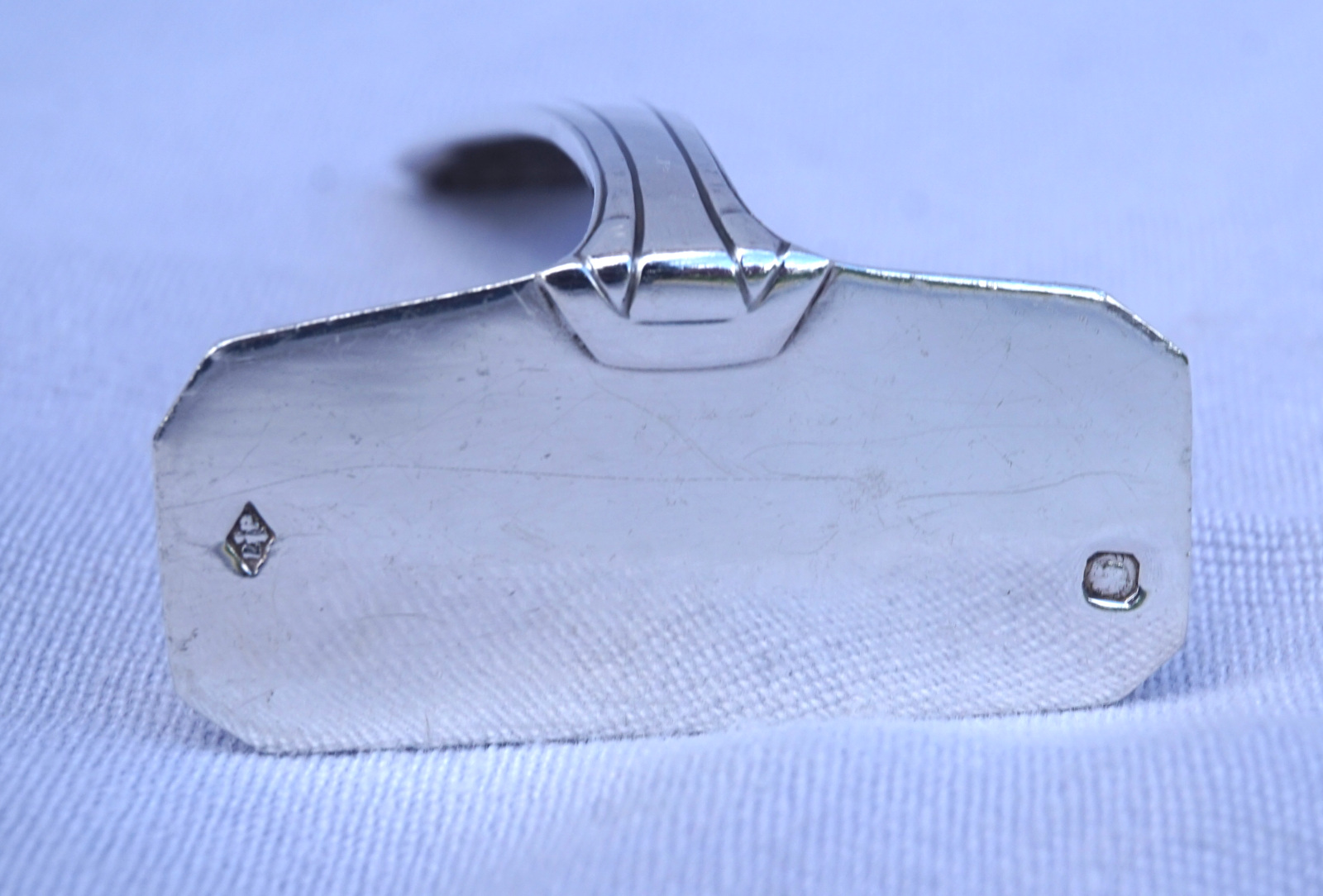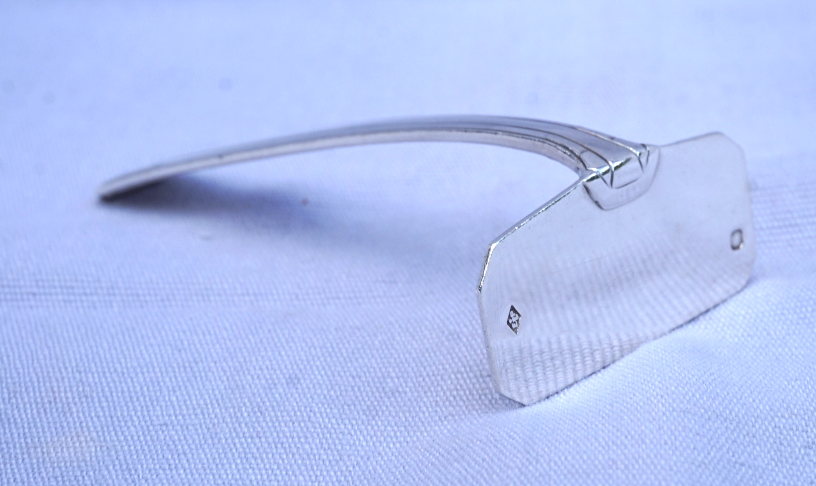 Poussoir en argent massif pour bébé Paris vers 1930. Poinçons Minervet et maïtre orfèvre. Longueur 9 cm, largeur 4.6 cm, poiuds 26.40 gr. Très bel état.