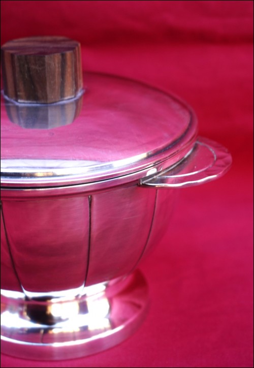 Sucrier Art Déco à couvercle, en métal argenté, à bouton palissandre, par MB vers 1930. Poinçon d'orfèvre et de grammage sur le fond. Largeur anse à anse 15.2 cm, diamètre 12 cm, hauteur 11.5 cm. Parfait état.