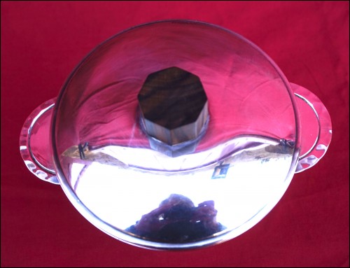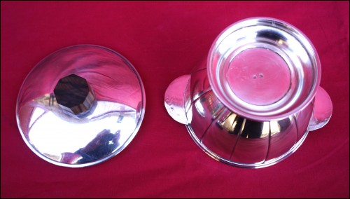 French Art Deco silverplate candy sugar lidded bowl with rosewood knob made by MB during the 1930's. It's hallamrked on the base. 6" (15.2cm) width handle to handle, 4 3/4" (12cm) diameter, 4 1/2" (11.5cm) height. Perfect condition as shown by the following pictures.