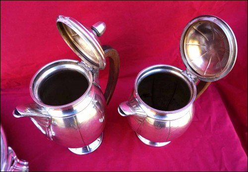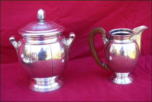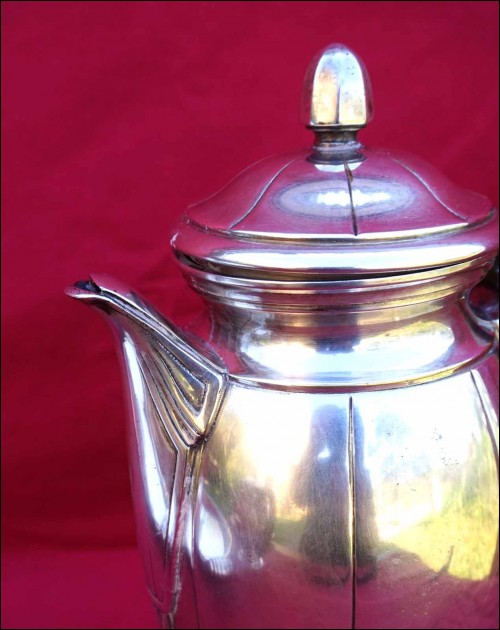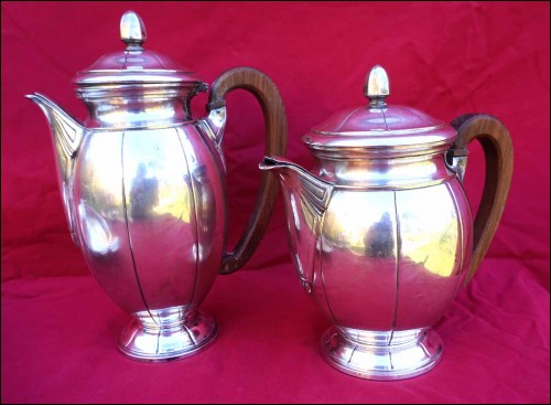 French Art Deco silverplate tea coffee service with tray made by Orbrille Paris during the 1940's. All the pieces are hallmarked. They measure for the coffee pot 10" (25.4cm) height, 7 1/2" (19cm) width from the handle to the spout; for the tea pot 7" (17.7cm) height, 7 1/2" (19cm) width fromthe handle to the spout annd for the tray 23 3/4" (60.3cm) length with the handles by 12 1/2" (31.5cm) width, weight of the set 7lb 14.98oz (3.6 kilograms). Good condition condition the handle of the creamer needs repair as shown by the following pictures.