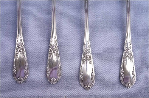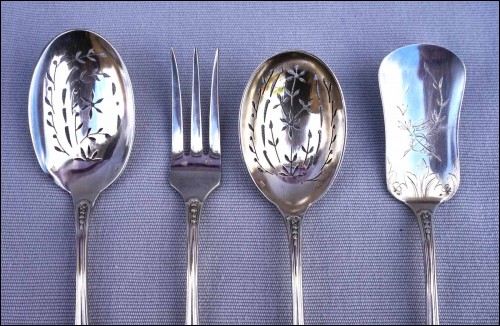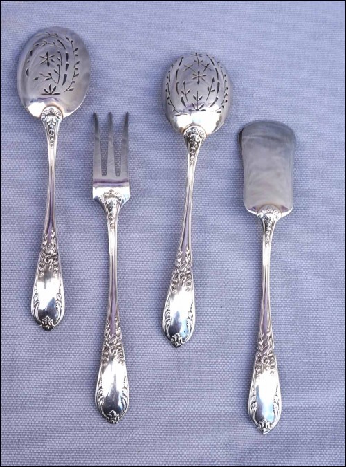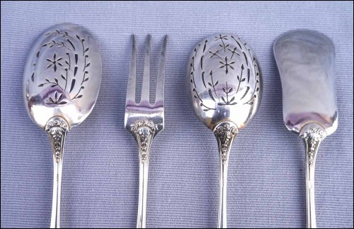 French Art Nouveau appetizer cocktail serving set, 4 pieces, made by SFAM Paris during the 1900's. They are hallmarked. 6 5/8" (17cm) length for the largest spade and 6 1/2" (16.5cm) length for the fork. Perfect condition in as shown by the following pictures.