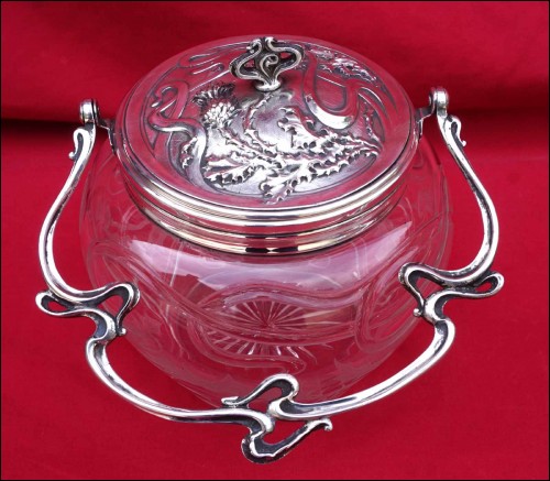 Seau à biscuits Art Nouveau en cristal de la maison Daum et monture de Victor Saglier, fin du XIXe siècle. L'ensemble est orné de Chardons symbolisant Nancy et la Lorraine, la monture est signée. Hauteur total avec l'anse 25.5 cm, hauteur sans l'anse 15.2 cm, diamètre au corps 15.2 cm Très bel état.