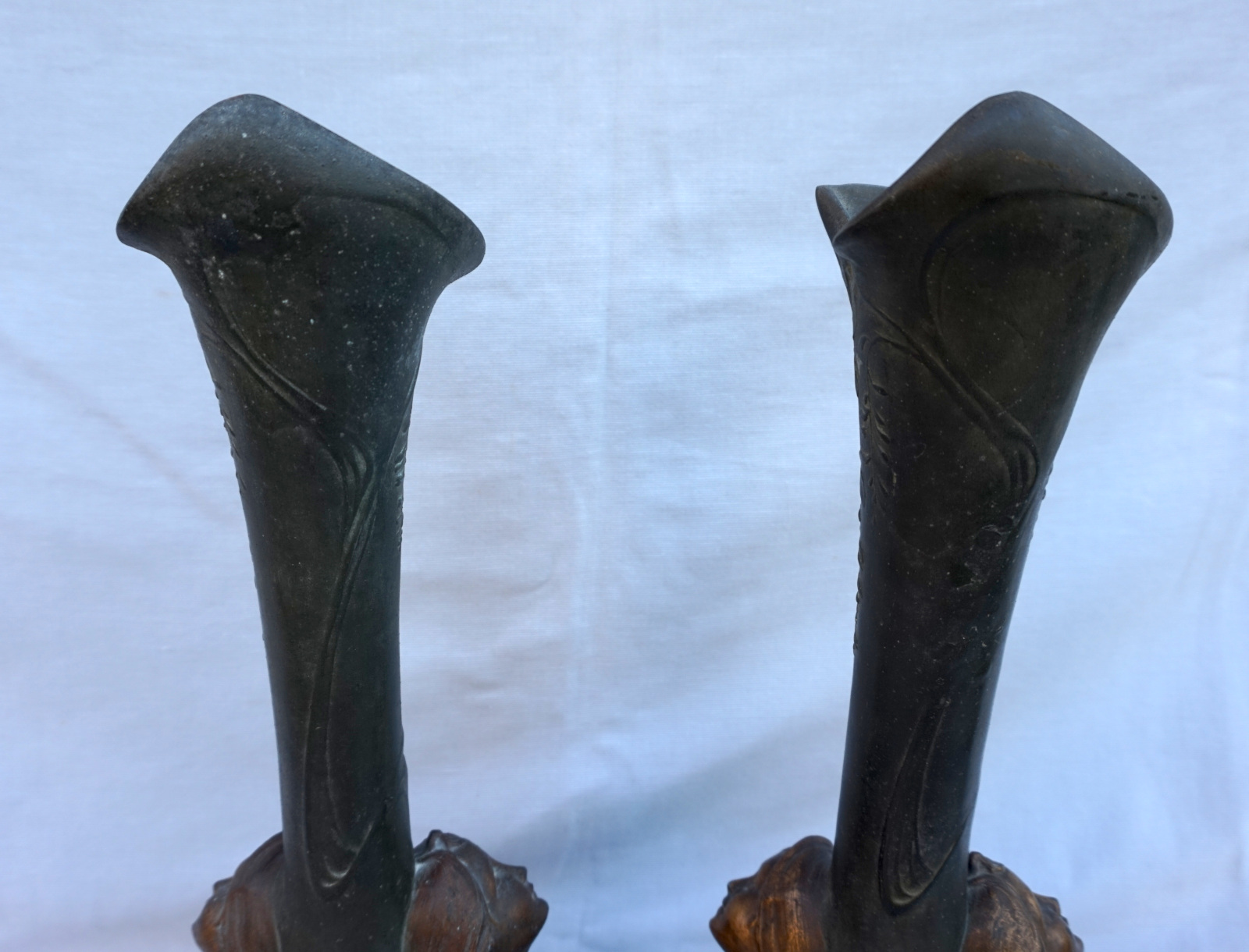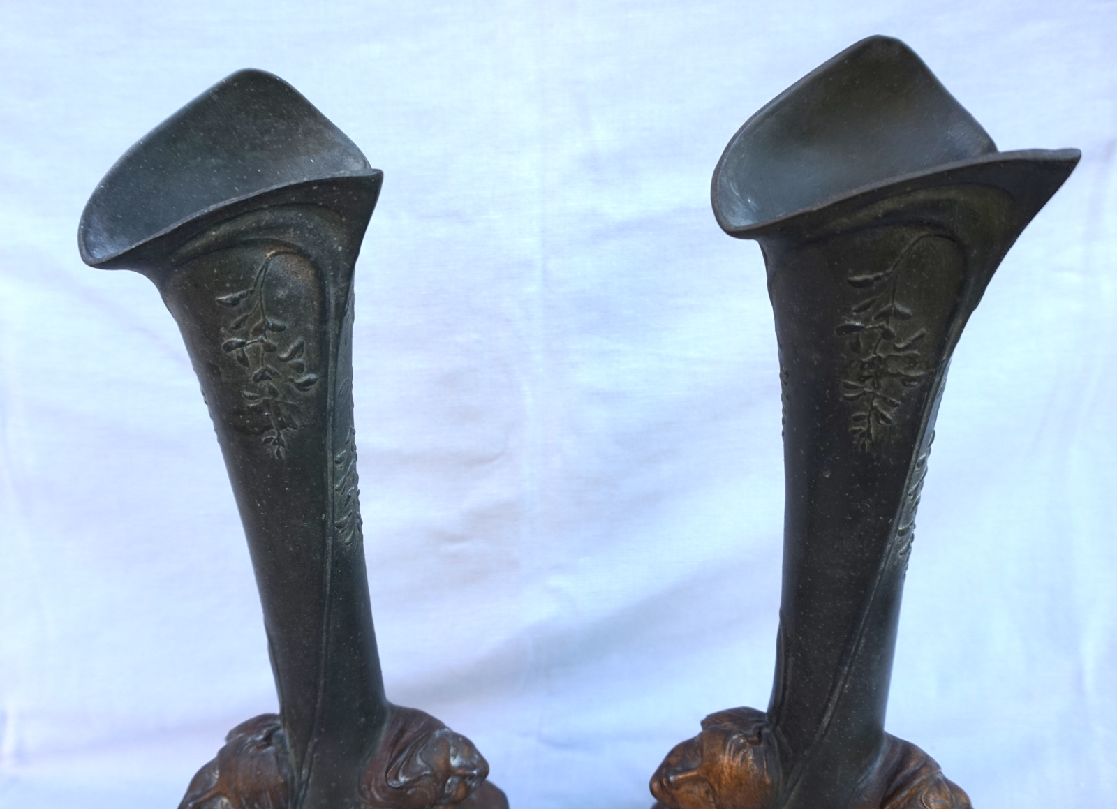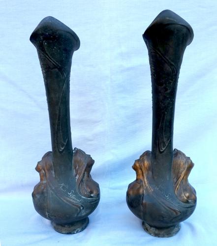 Paire de vases en étain Art Nouveau à 2 visages par Mle SIbeud vers 1900. Ils sont signés dans le décor. Hauteur 44.5 cm, diamètre au corps 16.5 cm, poids de la paire 4.880 kg. Une déchirure sur un coté d'un vase et les deux vases sont perçés sur leurs fonds.