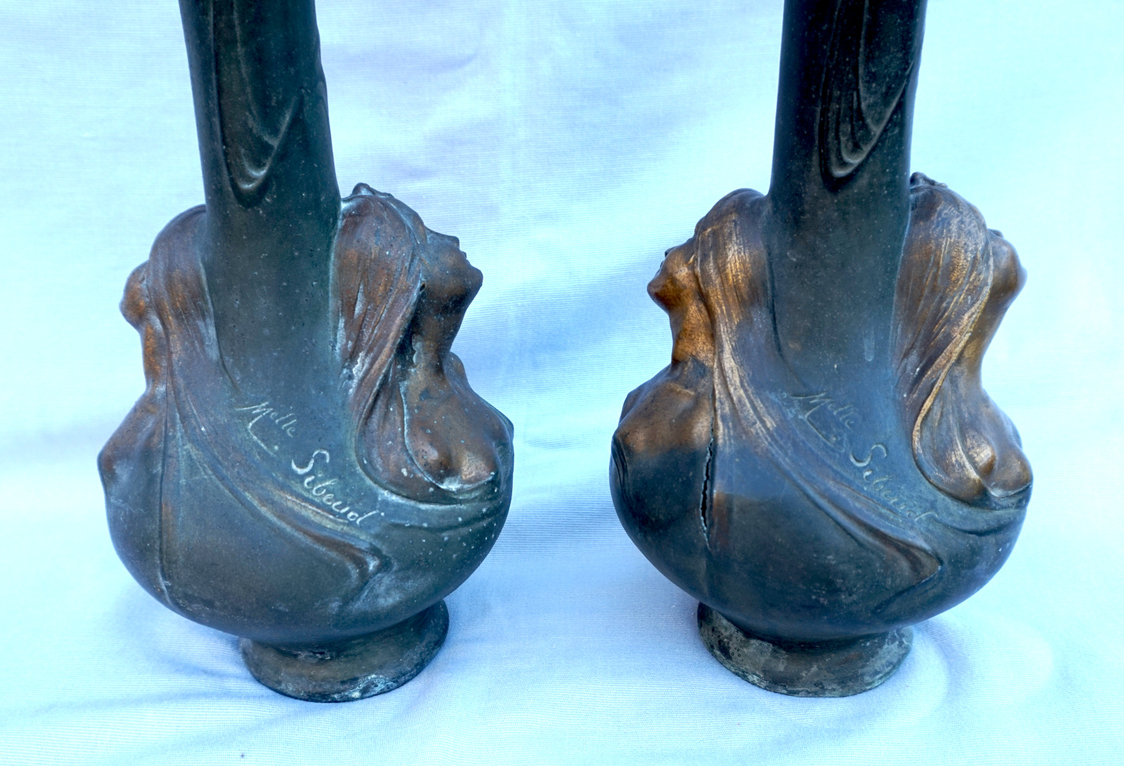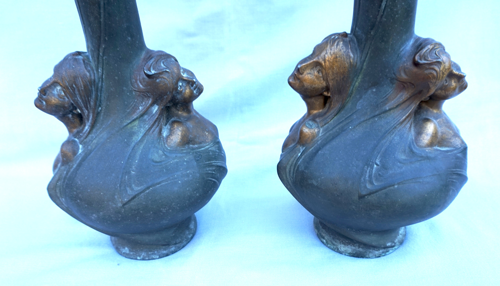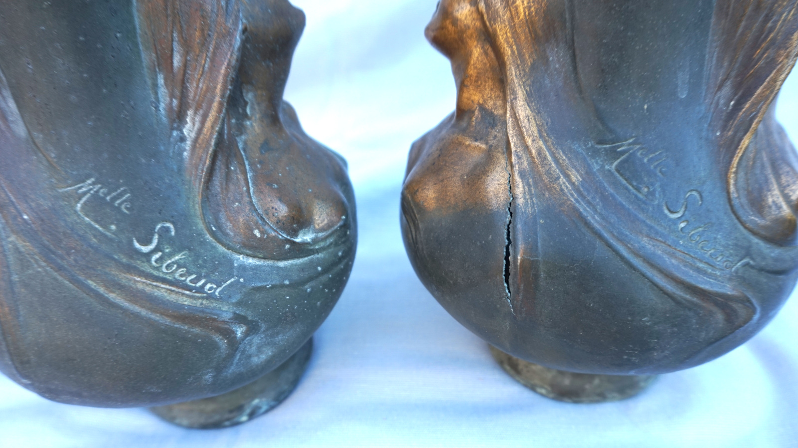 French Art Nouveau pair of pewter vase showing 2 gilt lady head made by Melle (Hélène) Sibeud during the 1900's. They are signed in front. 17 1/2" (44.5cm) height, 6 1/2" (16.5cm) diameter to the body, weight 10lb 12oz (4.880 kilograms). One vase with tear and the both are pierced on the bottom as shown by the following pictures.