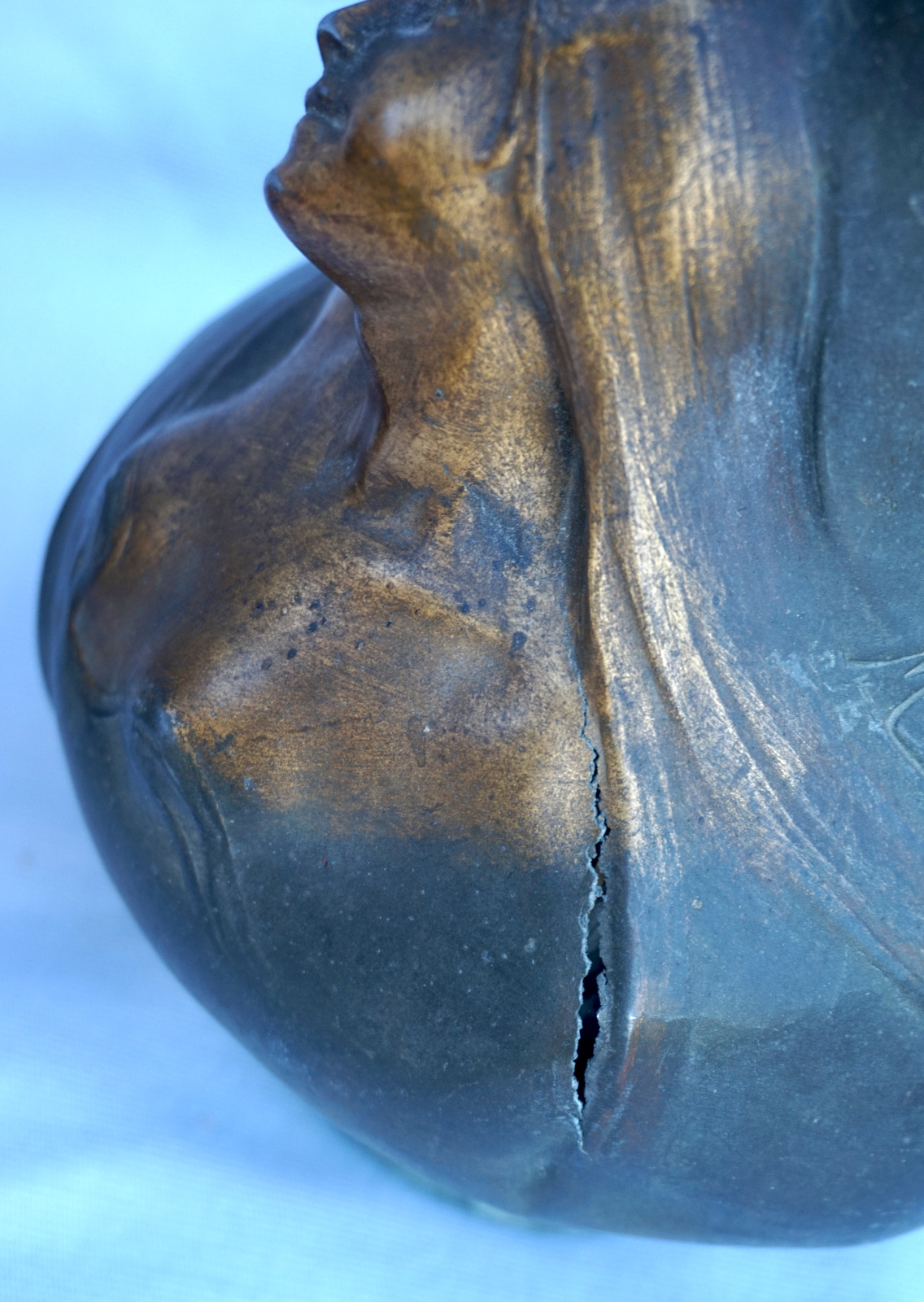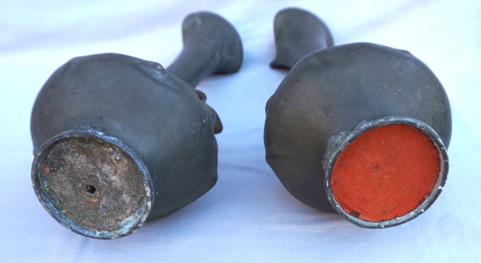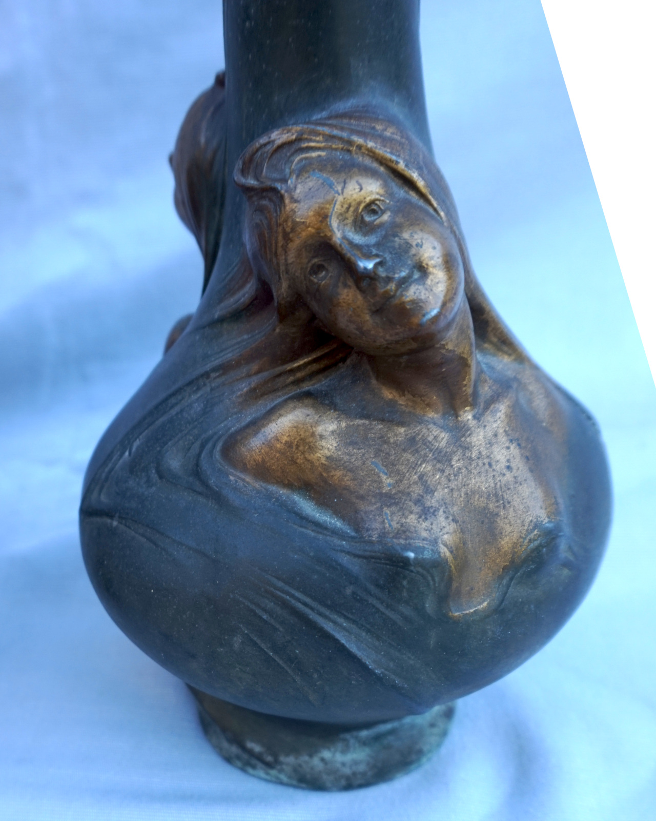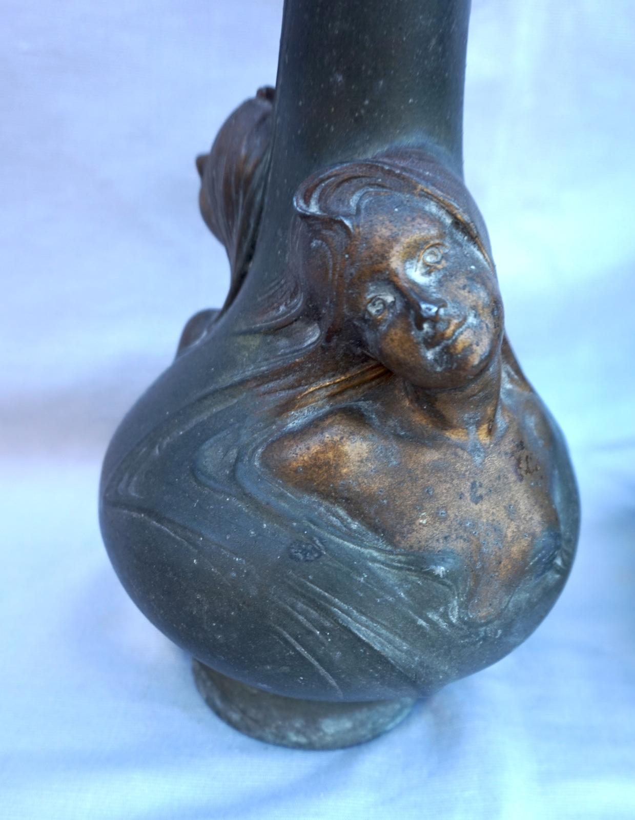 French Art Nouveau pair of pewter vase showing 2 gilt lady head made by Melle (Hélène) Sibeud during the 1900's. They are signed in front. 17 1/2" (44.5cm) height, 6 1/2" (16.5cm) diameter to the body, weight 10lb 12oz (4.880 kilograms). One vase with tear and the both are pierced on the bottom as shown by the following pictures.