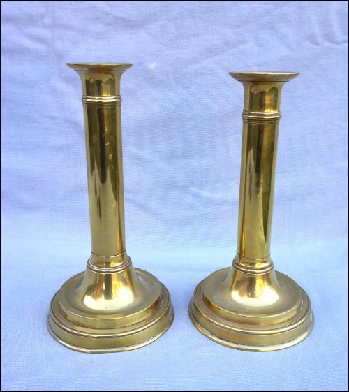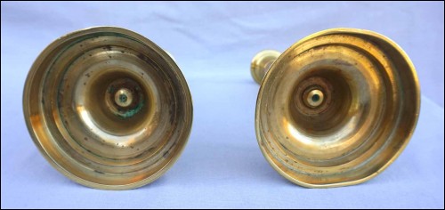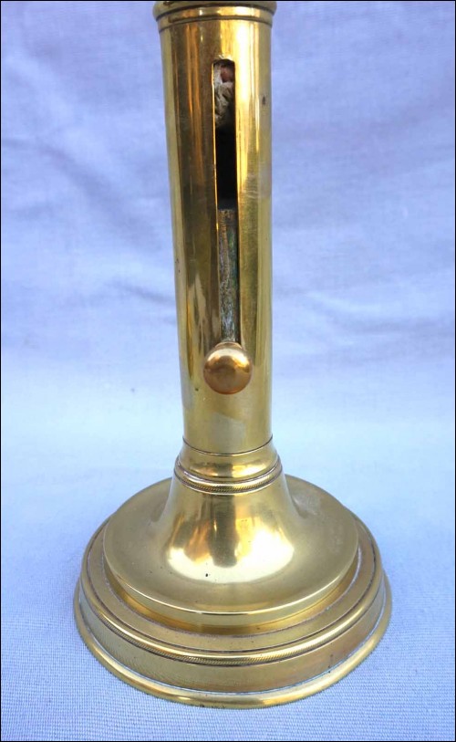 French pair of push up candlestick in brass made late 19th century. 8 5/8" (22cm) height, 4 1/2" (11.4cm) diameter. Good condition one push up mecanism is missing as shown by the following pictures.