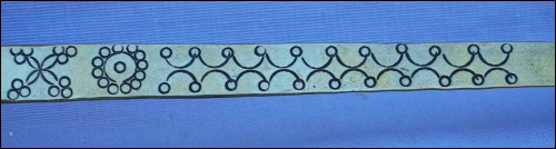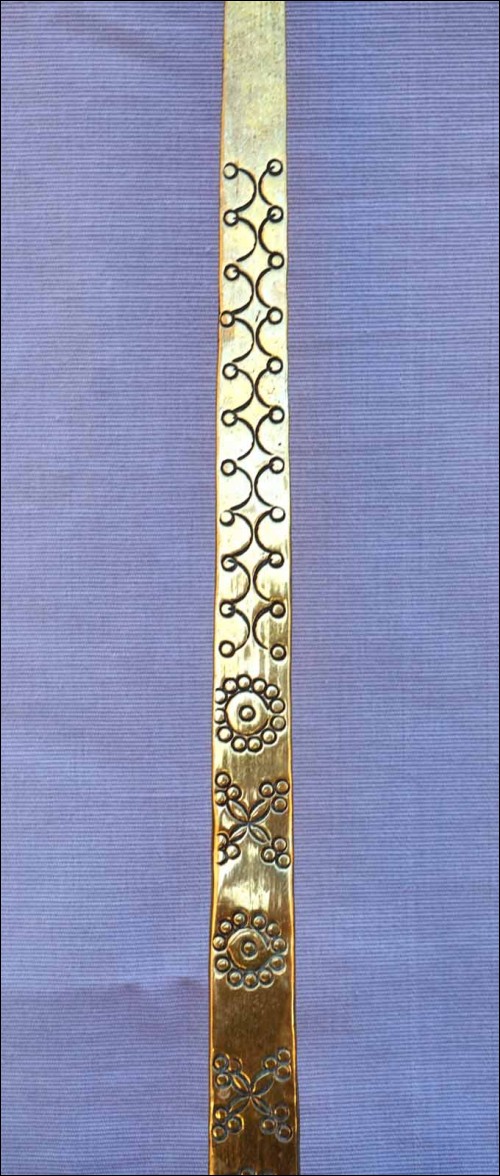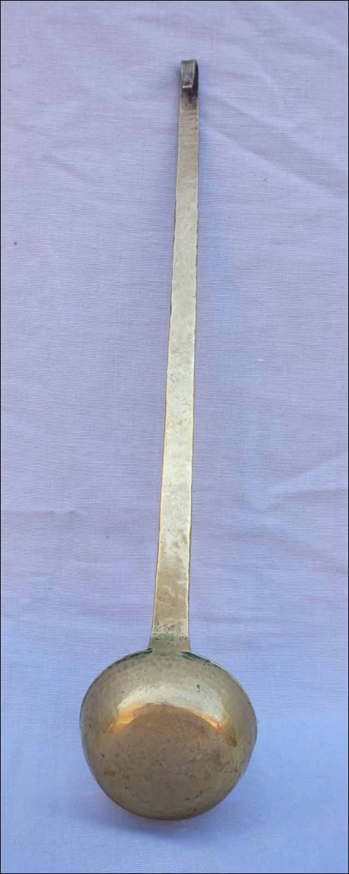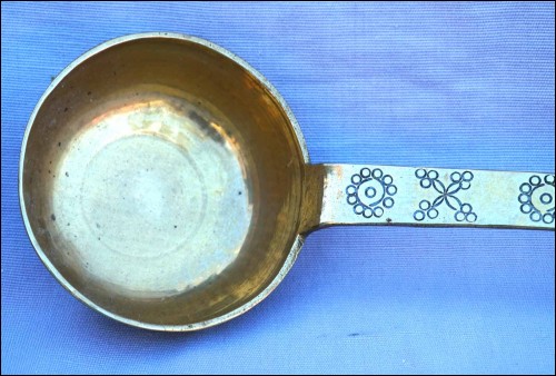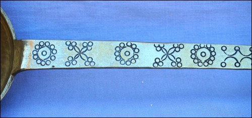 Louche crêpe/galette en laiton gravé et martelé, Bretagne fin XIXe siècle. Longueur 49.5 cm, diamètre 11.2 cm. Très bel état.