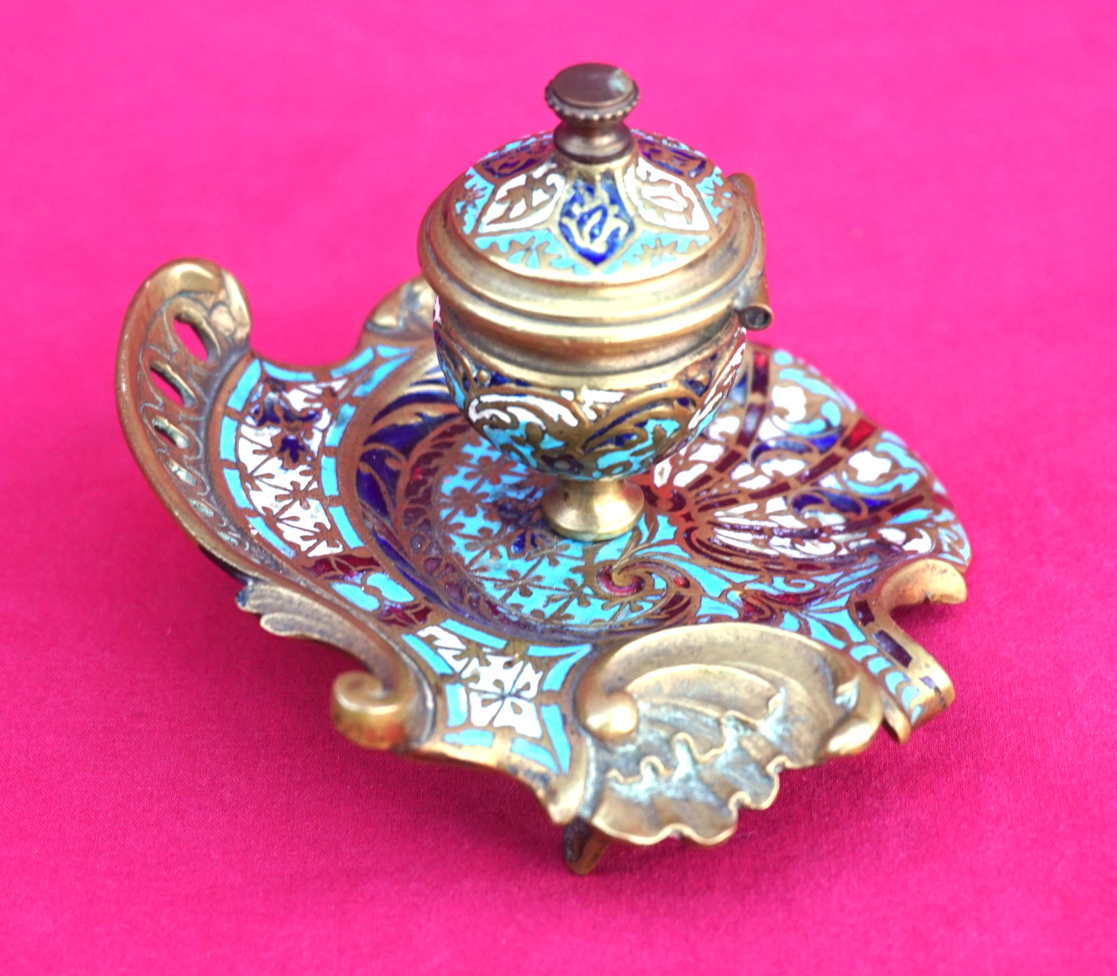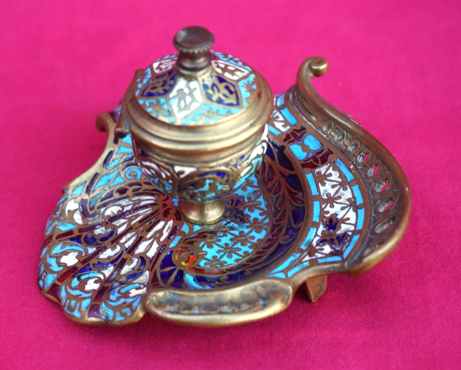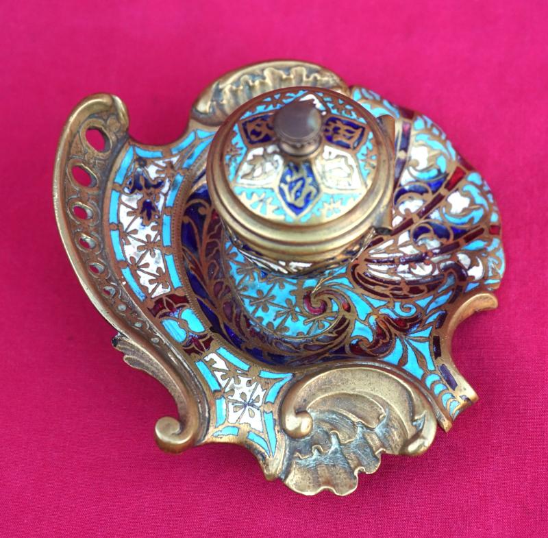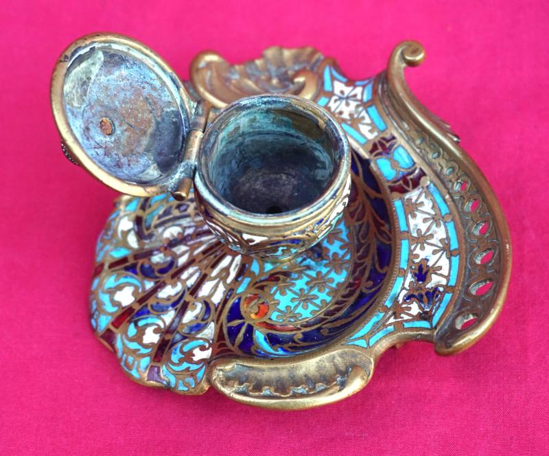 French champleve enamel gilt brass scalloped inkwell made late 19th century. 3 3/4" (9.5cm) length, 3 3/4" (9.5cm) width, 2 3/8" (6cm) height. Perfect condition the glass inkwell is missing.