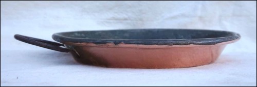 Petit plat a gratin ou oeuf en cuivre étamé et poignée fer. Diamètre 19cm, largeur avec l'anse 22.5cm, hauteur 2.8cm, poids 362gr. Très bel état.