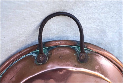 French chef cookware tin lined copper au gratin pan with iron handle for hanging. 7 1/2" (19cm) diameter, 8 7/8" (22.5cm) width with handle, 1 1/8" (2.8cm) height, weight 12.77oz (362 grams). Perfect condition as shown by the following pictures.