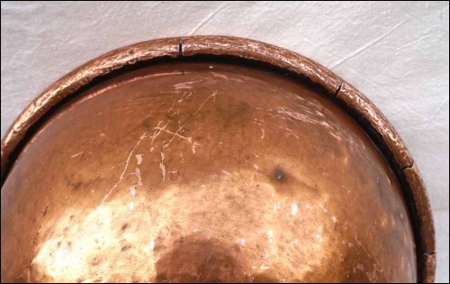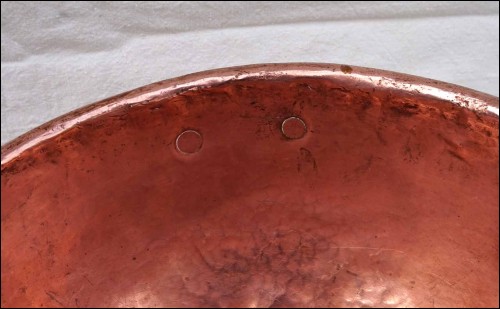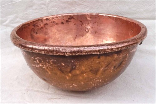 French chef cookware mixing whipping bowl with ring for hanging for chocolate , white egg, candy jelly lmade during the middle of the 20th century. 12 1/4" (31cm) diameter 7 1/8" (18cm) height thickness 1.1mm weight 3lb 11.57oz (1.689 kilogram). A few bumps and the tears od the back of the rolled edge as shown by the following pictures.