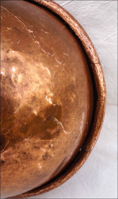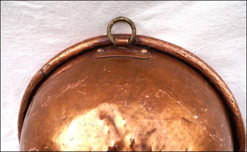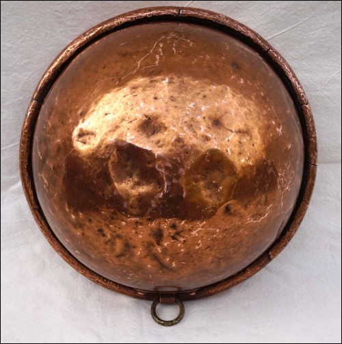 Cul rond en cuivre martelé pour chef pâtissier avec son anneau d'accroche, milieu du XXe siècle. Bel état, petites bosses et chocs. Hauteur 15 cm, diamètre 30,3 cm, épaisseur 1,1 mm, poids 1,689 Kg.