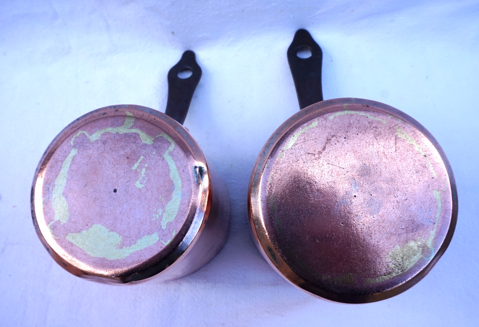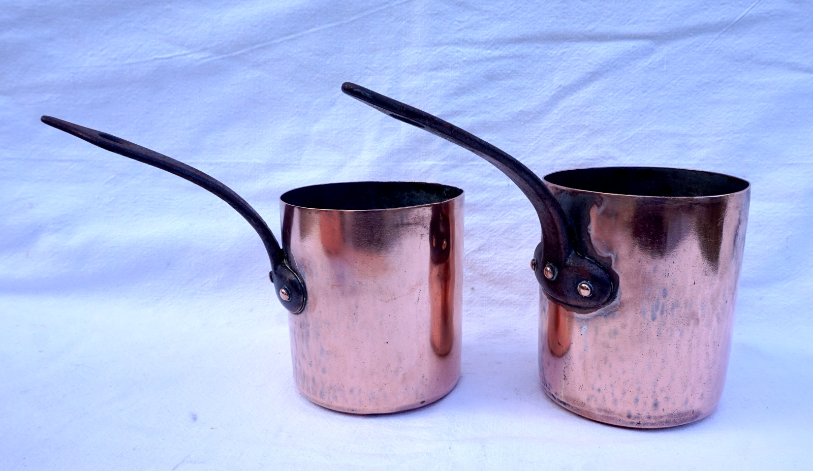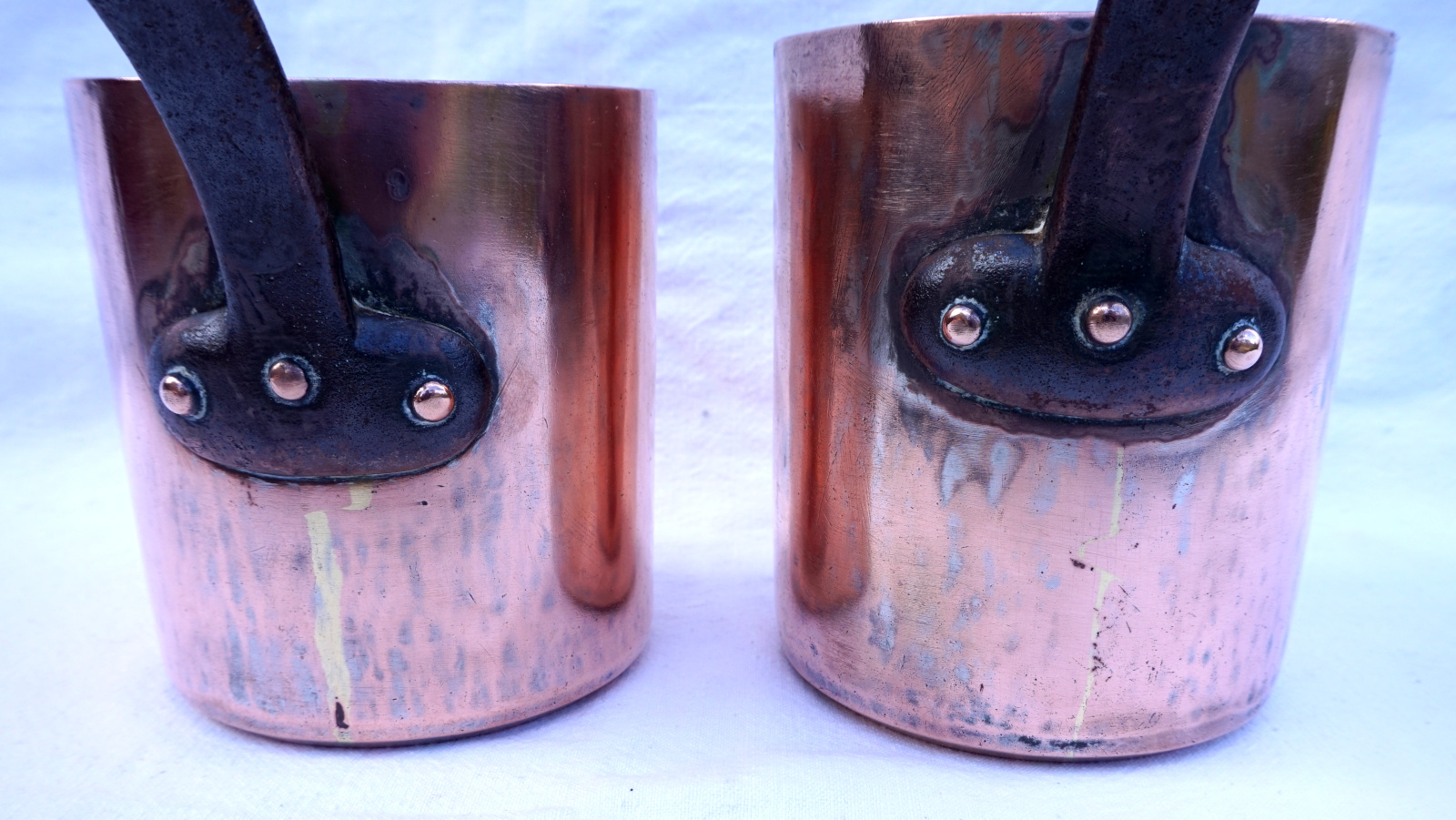 French chef cookware dovetailed tined copper pan of sauce pans with iron handles made late 19th century. The measure for the smallest 6 1/4" (16cm) total height, 4 1/4" (11cm) copper height, 4" (10cm) diameter, capacity 0.8 qt (0.75 liter), weight 1 lb 2.16oz (515 grams) and for the largest 87" (18cm) total height, 4 1/2" (11.6cm) copper height, 4 1/4" (10.6cm) diameter, capacity 1qt (1liter), weight 1lb 7.80oz (675 grams). Beautiful condition as shown by the following pictures.