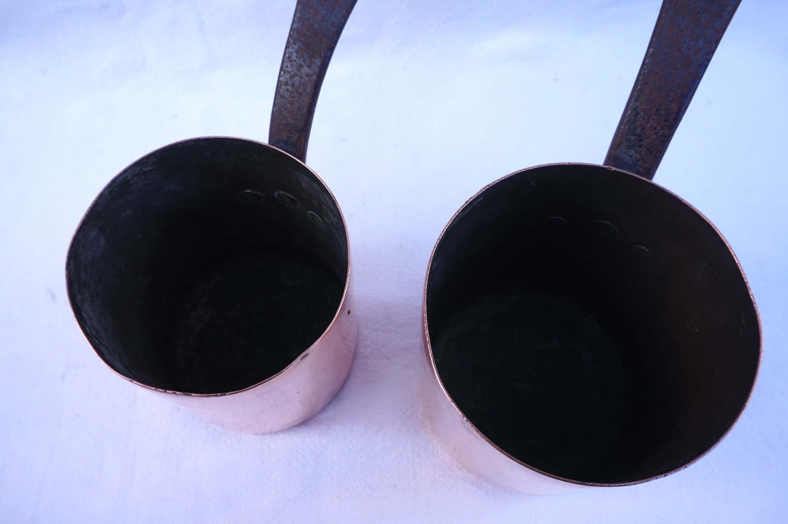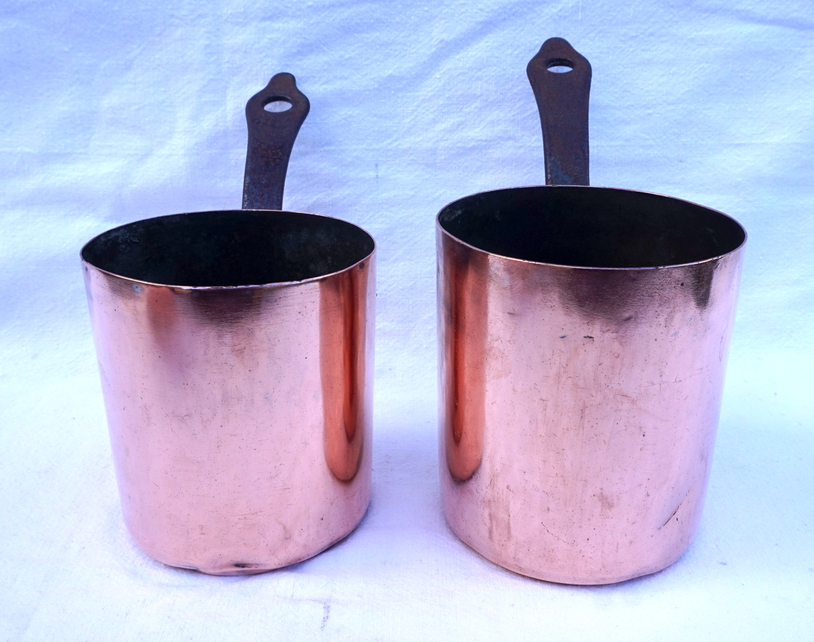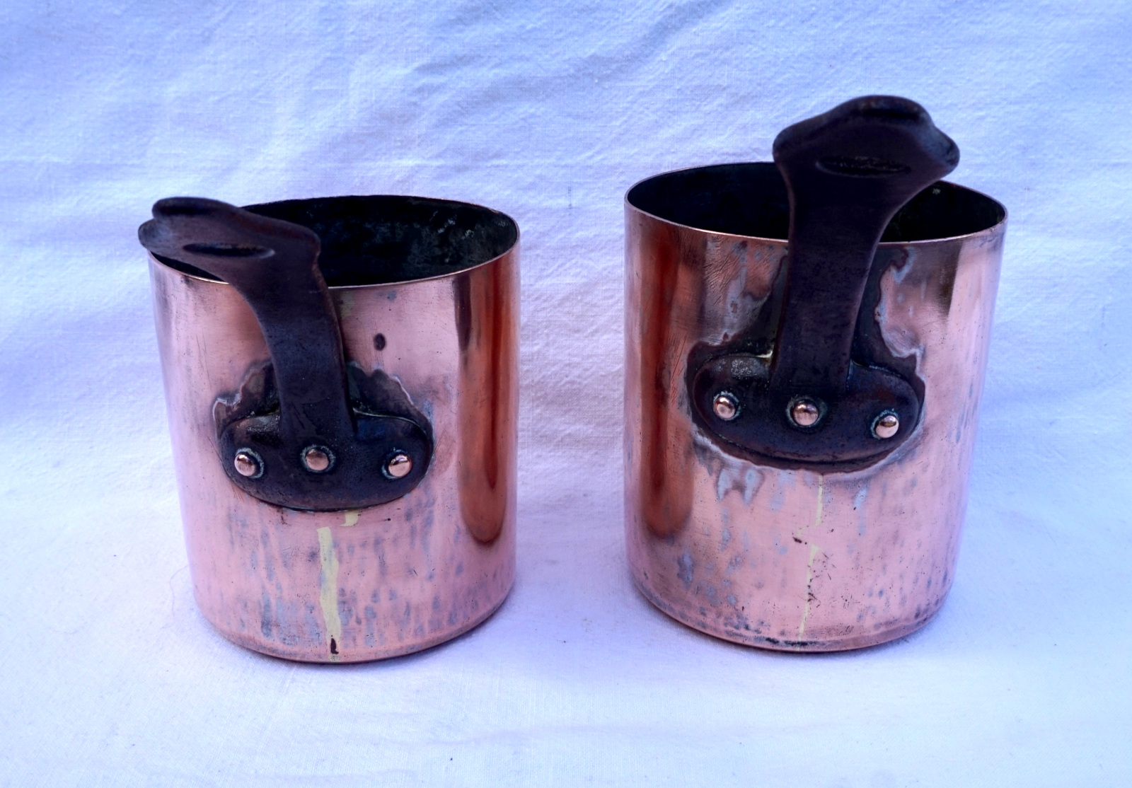 French chef cookware dovetailed tined copper pan of sauce pans with iron handles made late 19th century. The measure for the smallest 6 1/4" (16cm) total height, 4 1/4" (11cm) copper height, 4" (10cm) diameter, capacity 0.8 qt (0.75 liter), weight 1 lb 2.16oz (515 grams) and for the largest 87" (18cm) total height, 4 1/2" (11.6cm) copper height, 4 1/4" (10.6cm) diameter, capacity 1qt (1liter), weight 1lb 7.80oz (675 grams). Beautiful condition as shown by the following pictures.