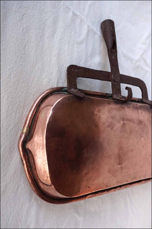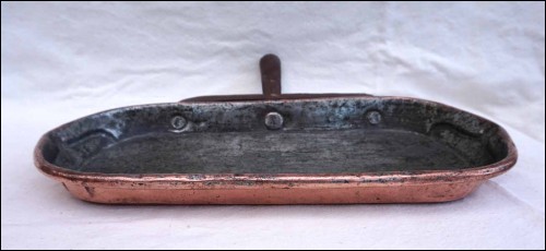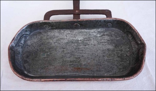 Lèche frite de cheminée en cuivre étamée et piétement fer, avec deux becs verseurs, fin XVIIIe siècle. Longueur 39,3 cm, largeur 19 cm, largeur avec le manche 34,3 cm, hauteur 4,5 cm, poids 1.077 kg. Très bel état.