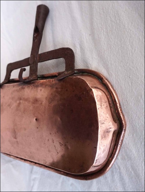French chef cookware grease, juice drip pan in tin lined copper width wrought iron foot and handle made during later 18th century. 15 1/2" (39.3cm) length, 7 1/2" (19cm) width, 13 1/2" (34.3cm) width with the handle, weight 2lb 6oz (1,077 kilogram). Perfect condition with beautiful patina as shown by the following pictures.