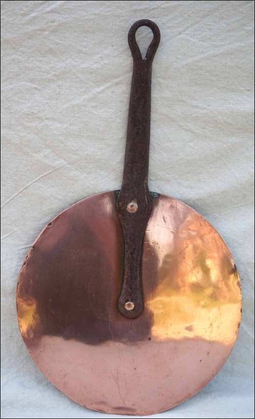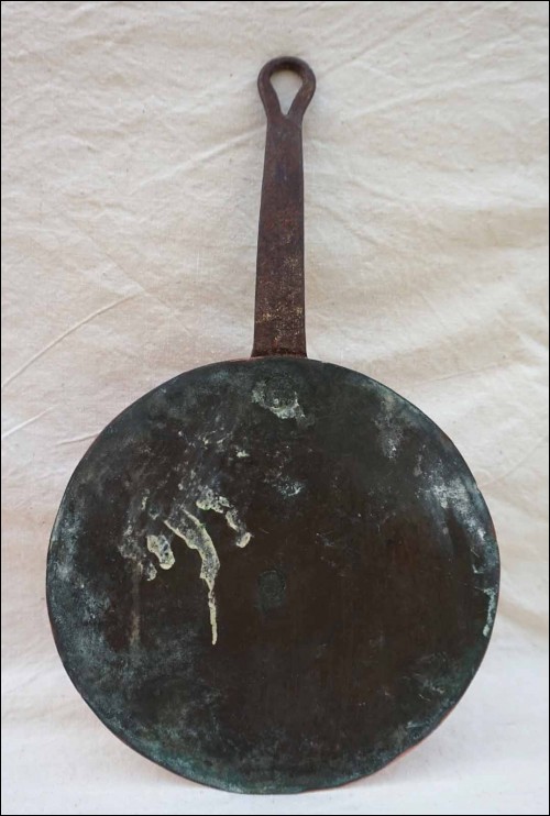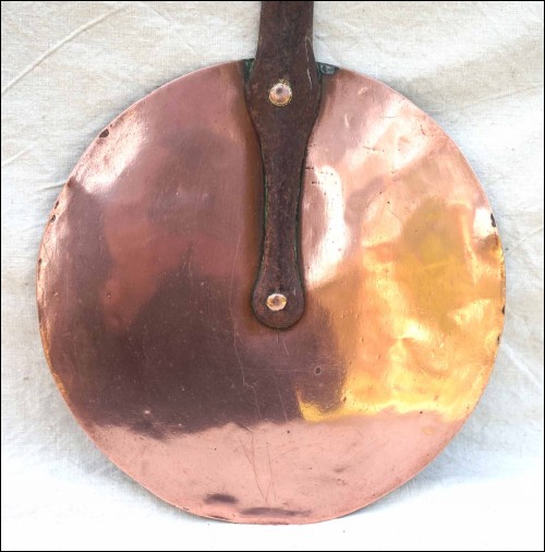 Couvercle en cuivre étamé à manche fer forgé riveté. Diamètre 22.5cm, largeur avec l'anse 38cm. Très bel état.