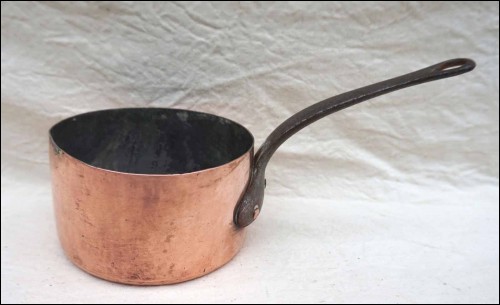 Casserole en cuivre étamé avec manche fer. Diamètre 13 cm, longueur 26 cm, hauteur 7,2 cm, épaisseur 1 mm, poids 509 gr.