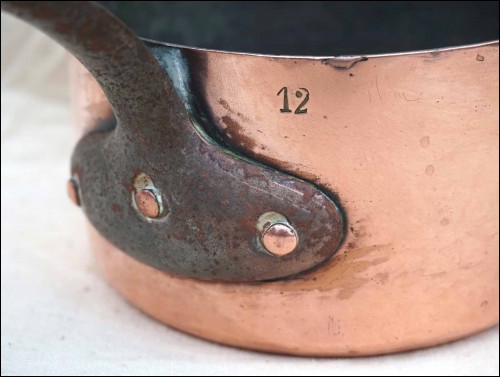 French chef cookware tin lined copper sauce pan made during the 1930's. 5 1/8" (13cm) diameter, 10" (26cm) width with the handle, 2 7/8" (7.2cm) height, 1mm thick, 1lb 1.95oz (0.509kilograms). Good condition a small bump as shown by the following pictures.