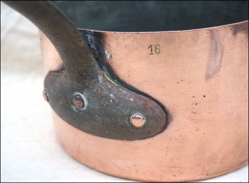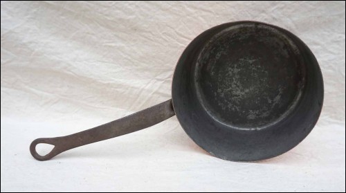 Casserole en cuivre étamé avec manche fer. Diamètre 16.2 cm, longueur 33.2 cm, hauteur 9.5 cm, épaisseur 1 mm, poids 929 gr.
