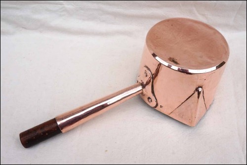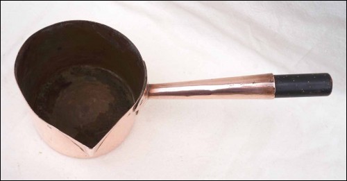 Casserole en cuivre pour la préparation des sucres ou sirop, avec bec verseur. Diamètre 15.5 cm, largeur avec la queue 38 cm, hauteur 10.5 cm, poids 1.194 kg. Bel état d'usage.