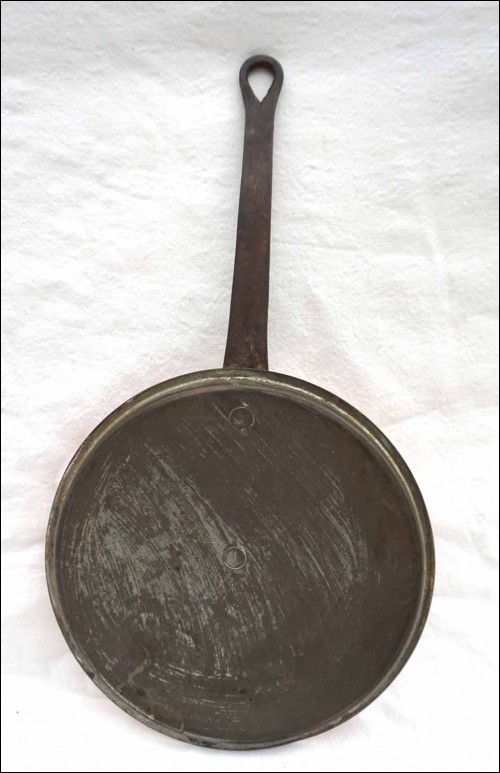 Couvercle en cuivre étamé à manche fer et rives cuivres, marqué 24. Diamètre 25.4 cm, longueur avec le manche 46 cm. Très bel état.