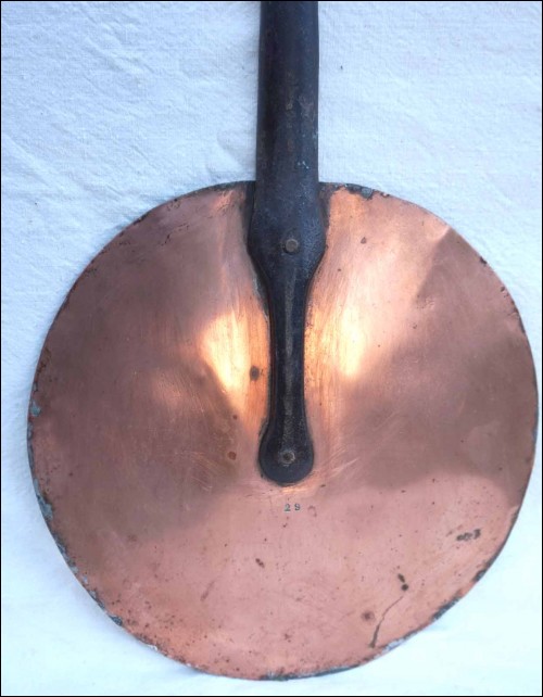 Couvercle en cuive étamé à manche fer et rives cuivres, marqué 18. Diamètre 19.5cm, longueur avec le manche 34cm. Très bel état.