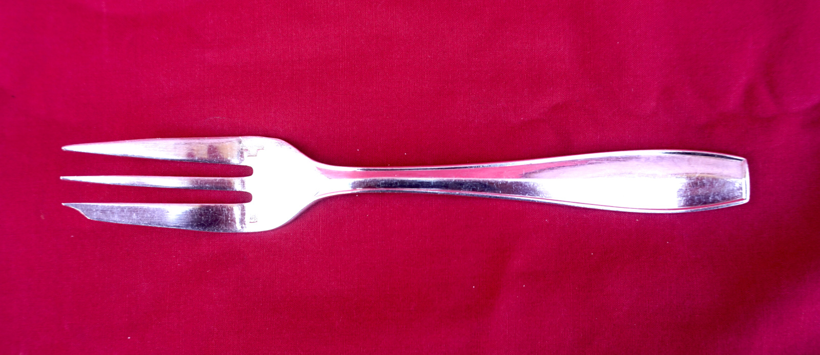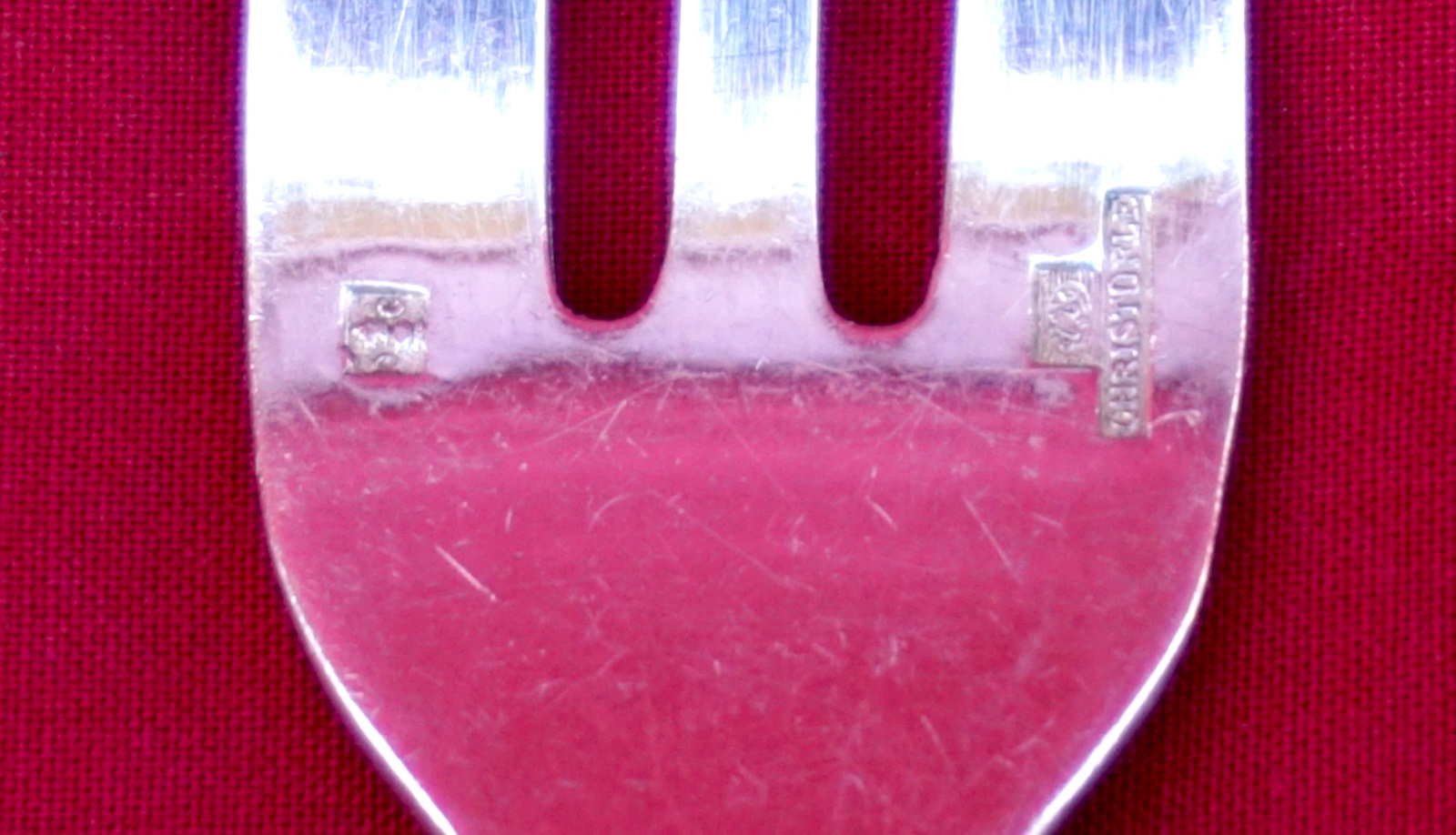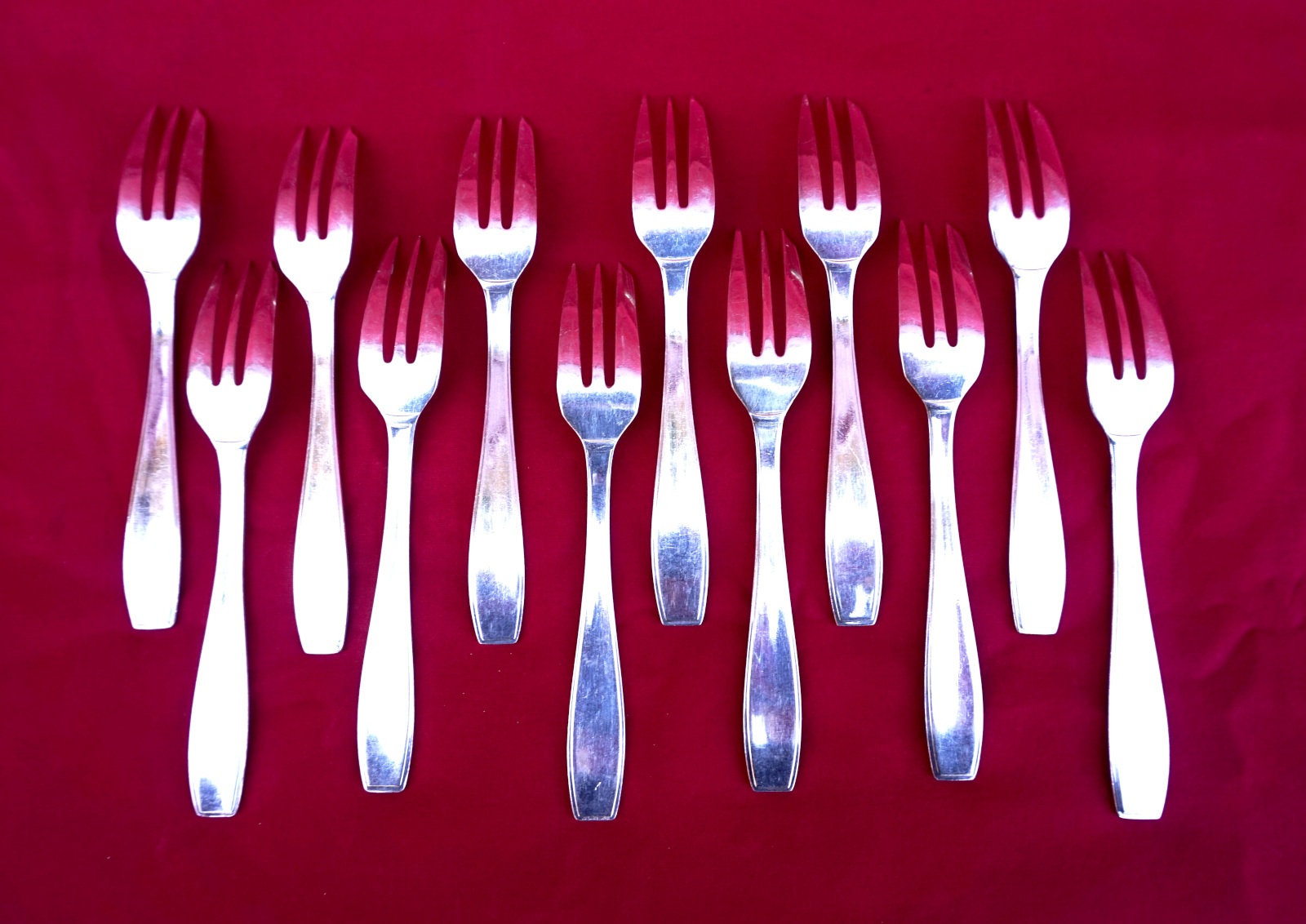 For our French-speaking friends 12 Fourchettes à gâteaux modèle Atlas, designer Luc Lanel, par Christofle. Longueur 15.1 cm. Bel état, quelques usures.