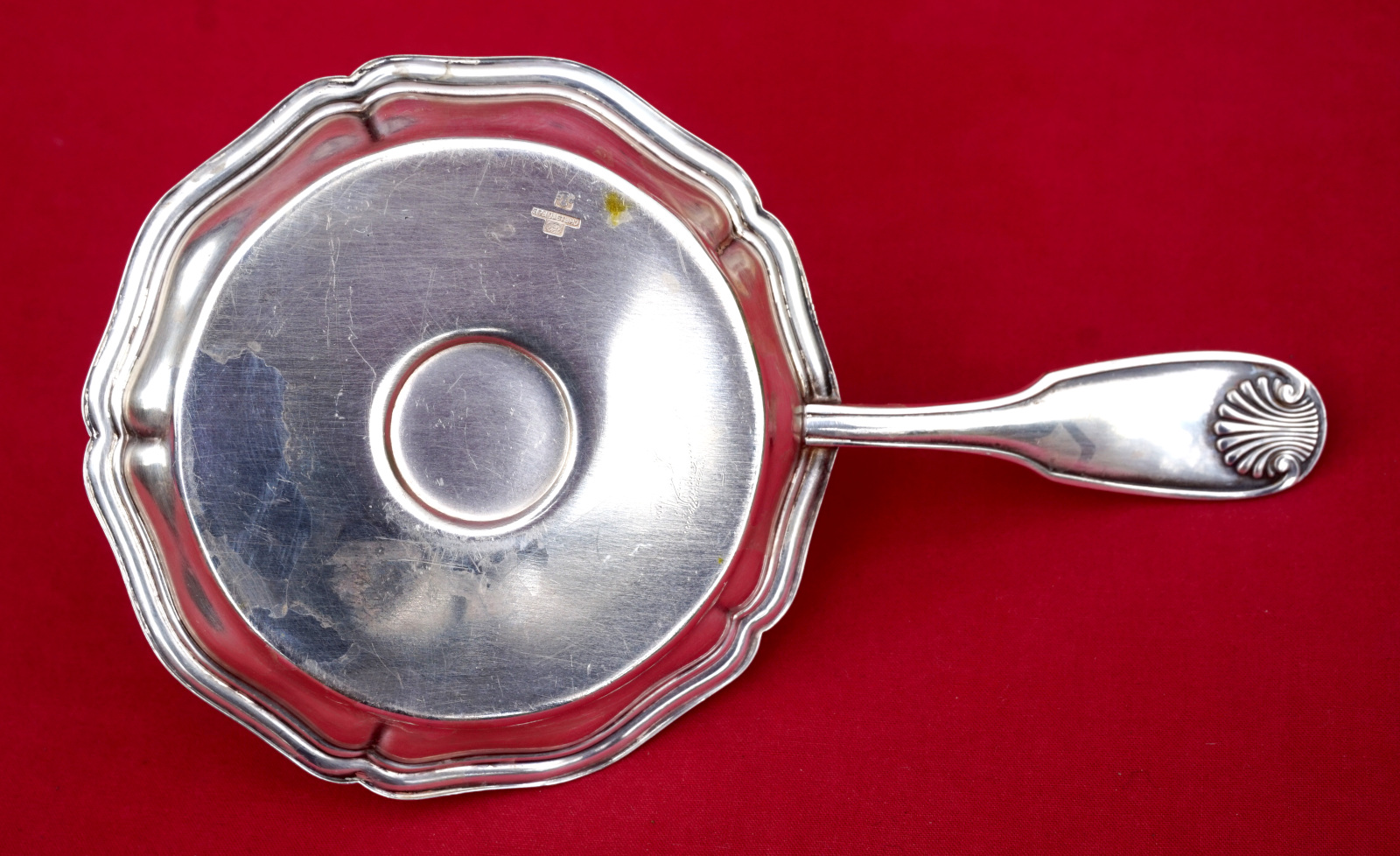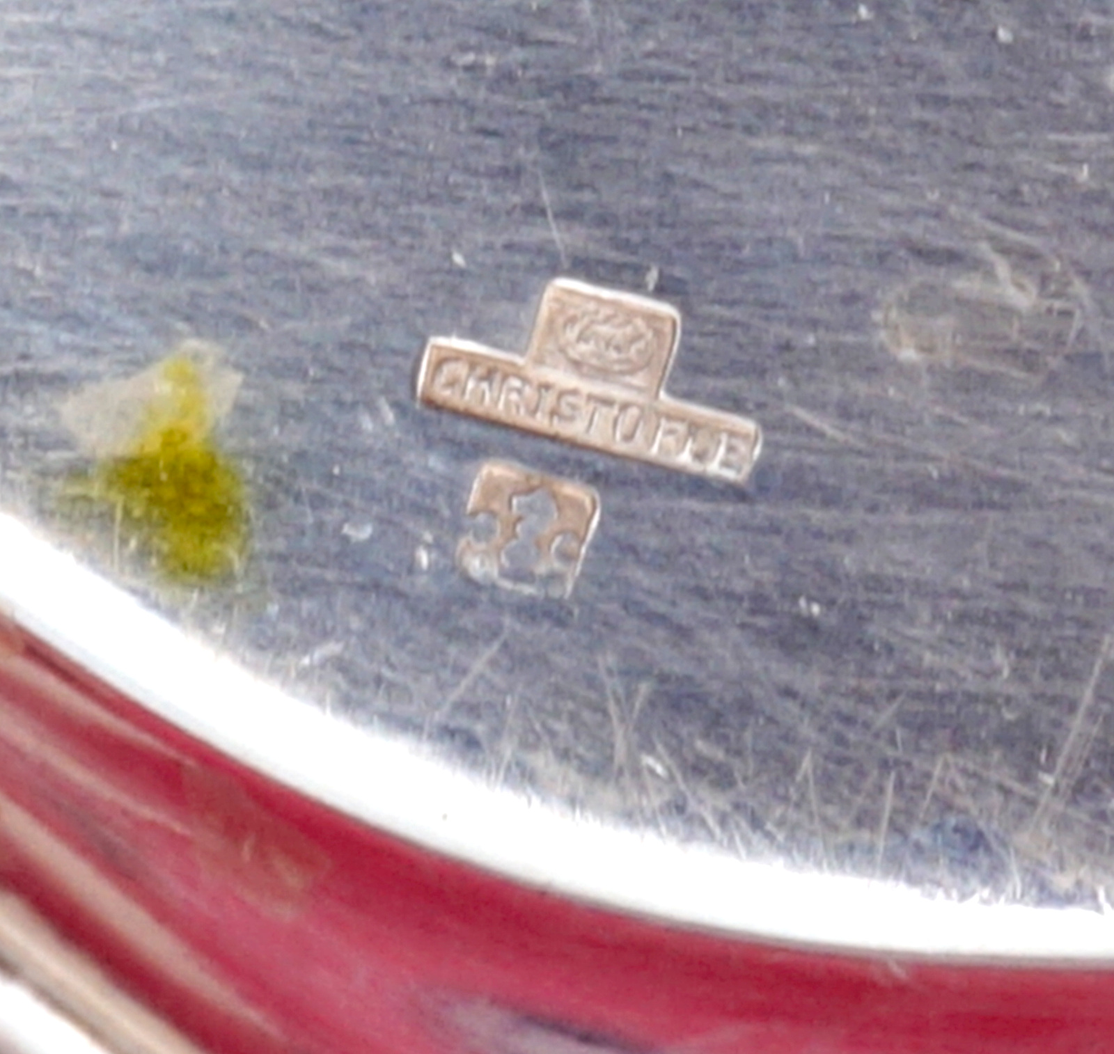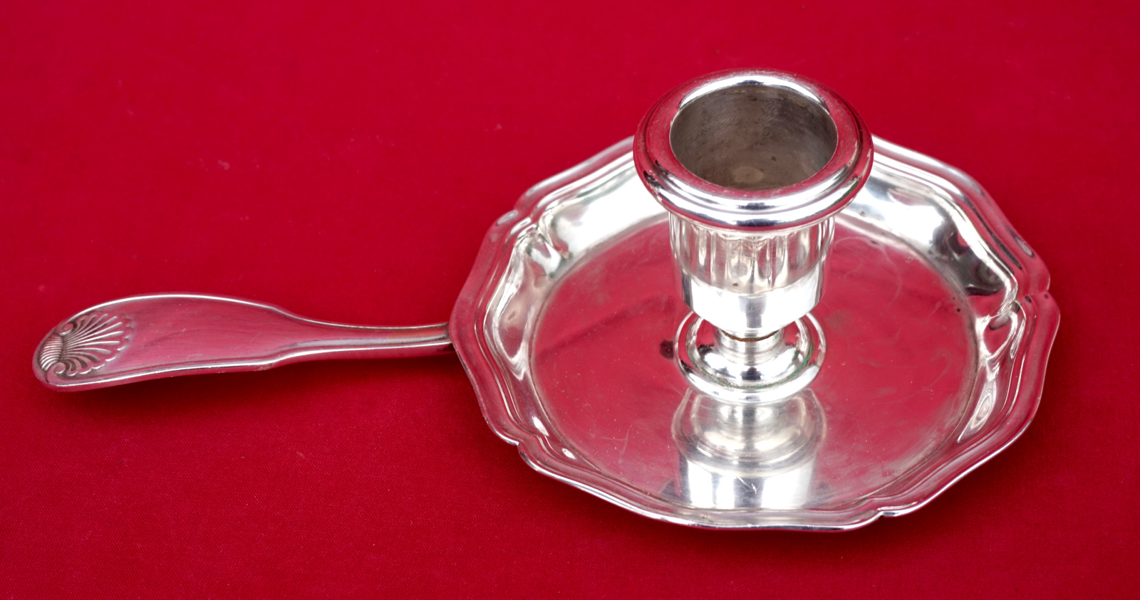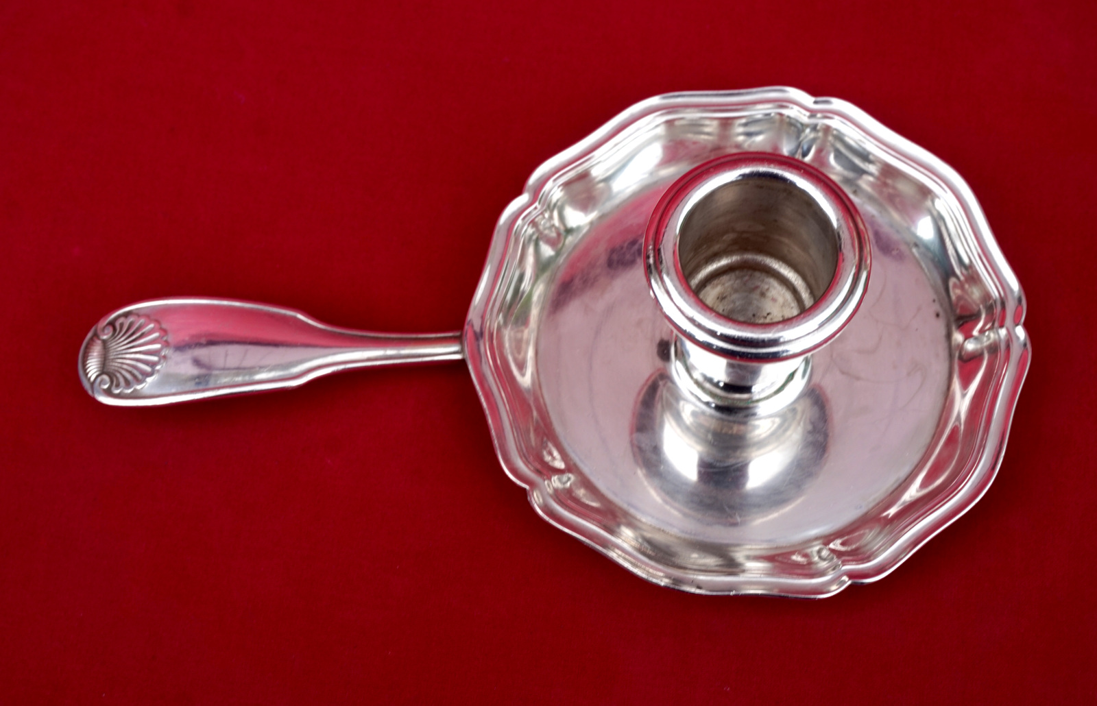 French silver plated chamber stick candle holder Vendome pattern made by Christofle. It's hallmarked on the back. 5 7/8" (15cm) width with handle, 3 1/2" (9cm) diametern 2" (5cm) height, weight 73grams. Good condition a few small stains.