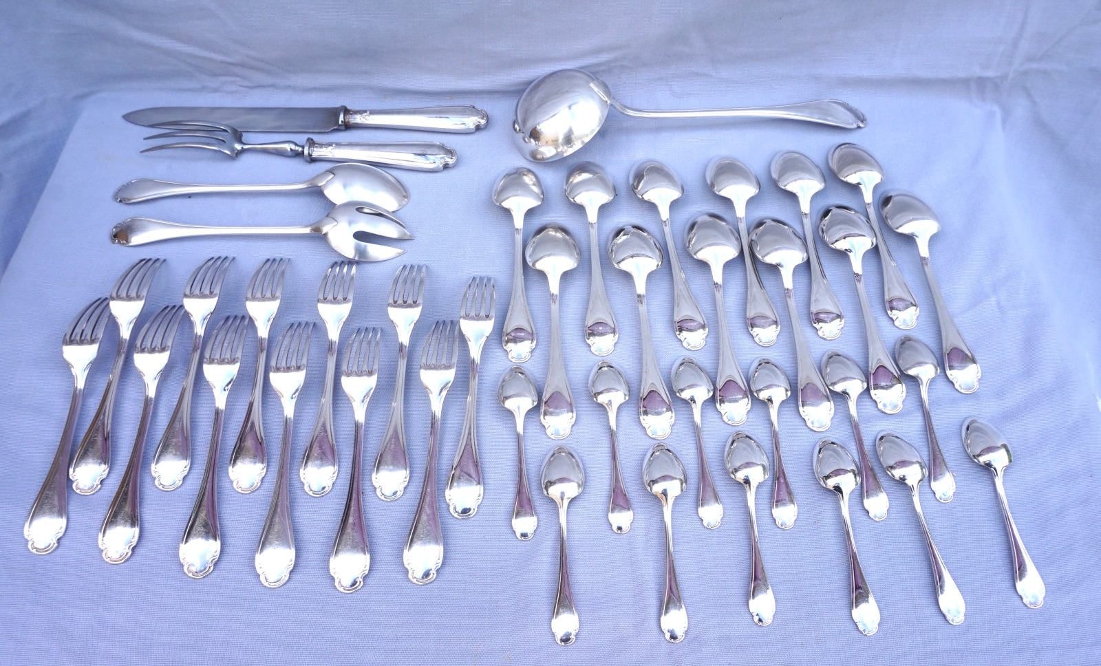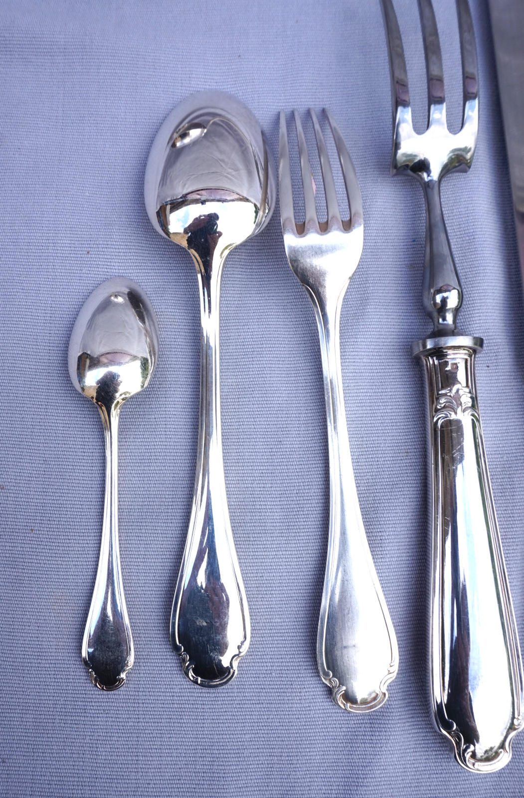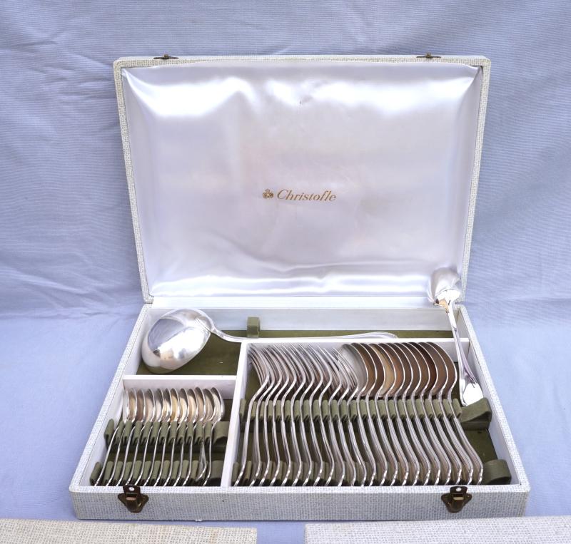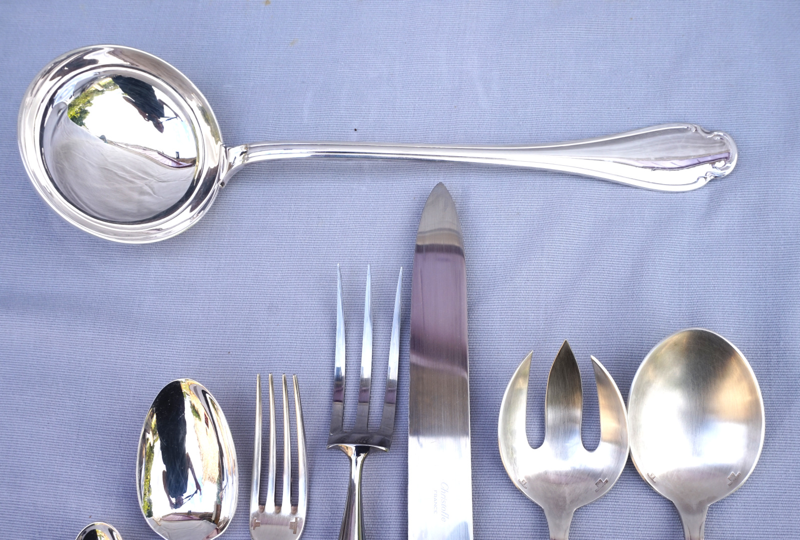 Ménagère en métal argenté modèle Pompadour de laison Christofle. Elle comprend: 12 cuillers et fourchettesde table, 12 cuillers dessert, 1 louche, 1 service à découper et 1 service à salade. Très bel état