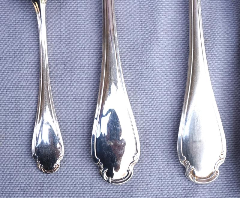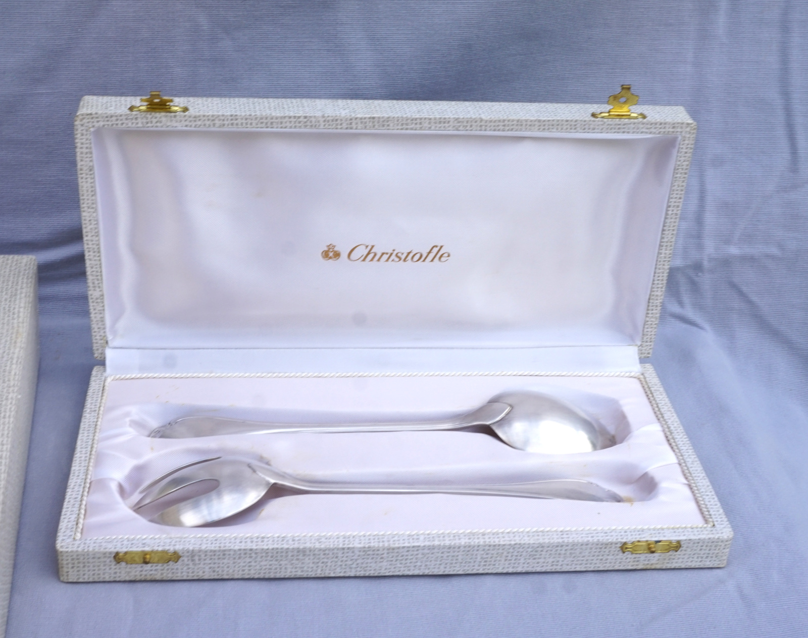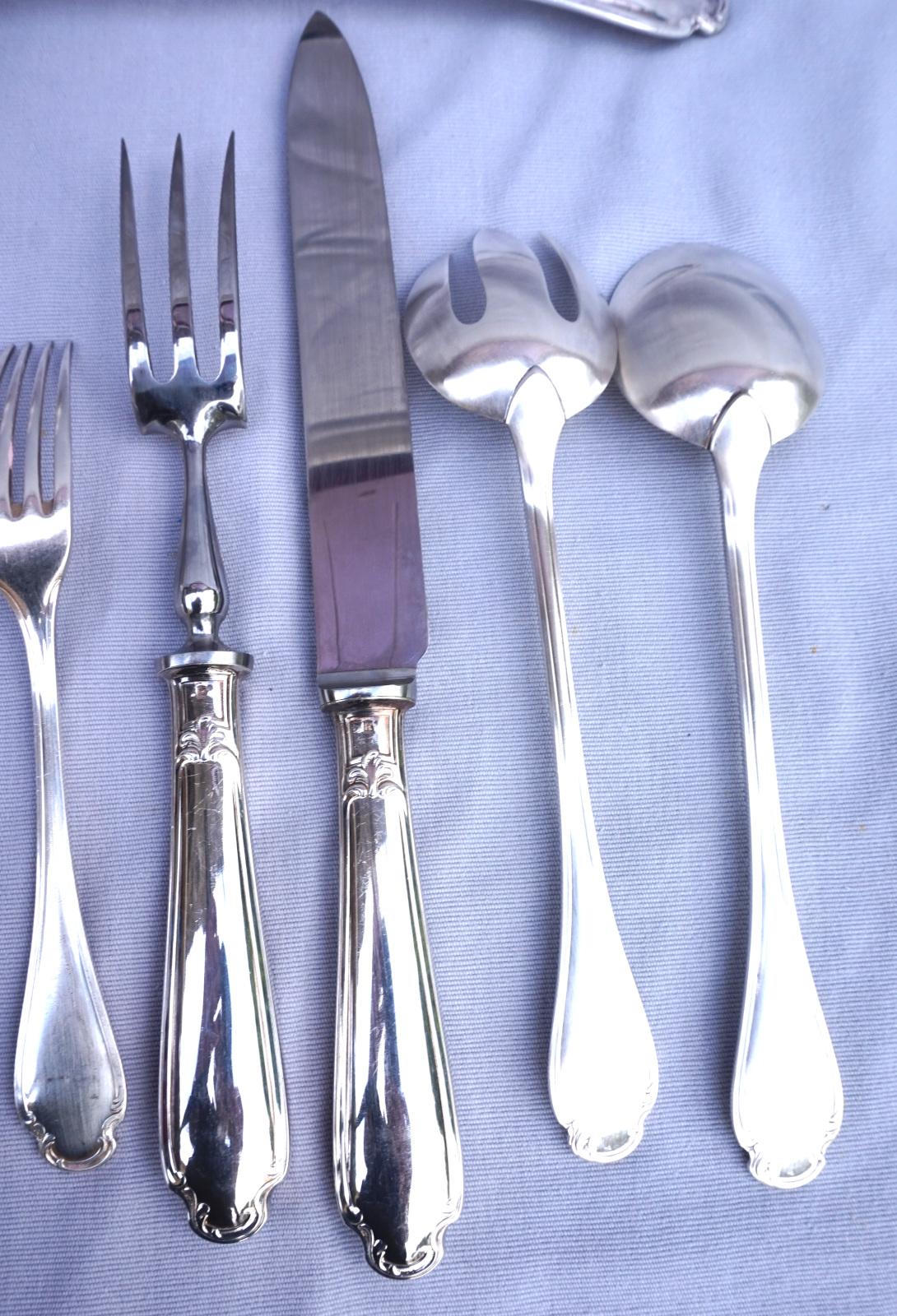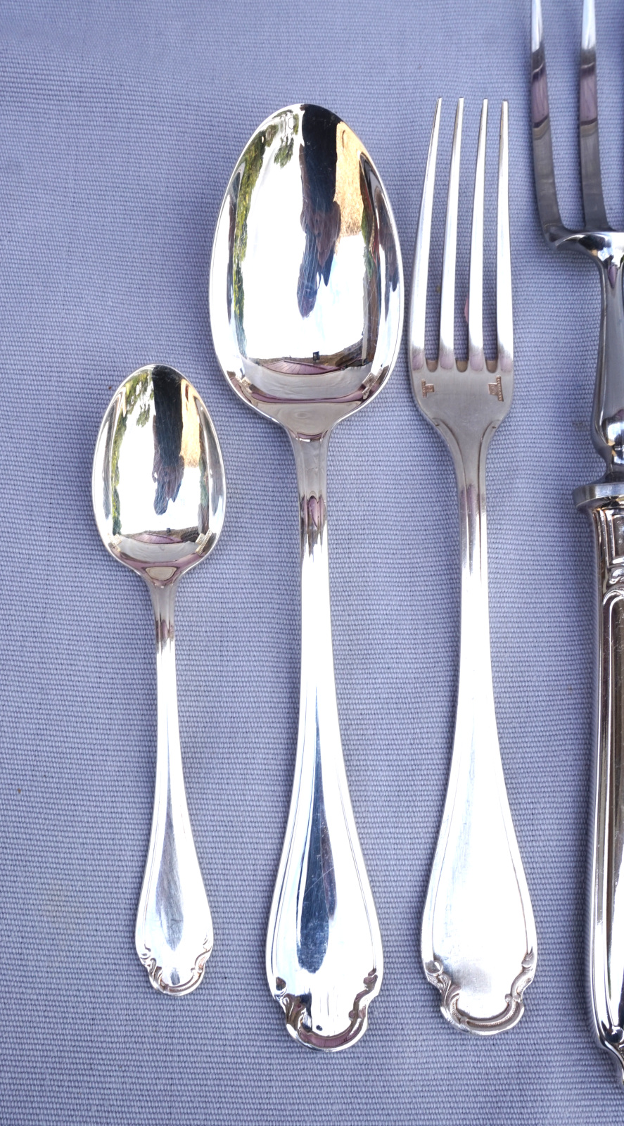 Ménagère en métal argenté modèle Pompadour de laison Christofle. Elle comprend: 12 cuillers et fourchettesde table, 12 cuillers dessert, 1 louche, 1 service à découper et 1 service à salade. Très bel état