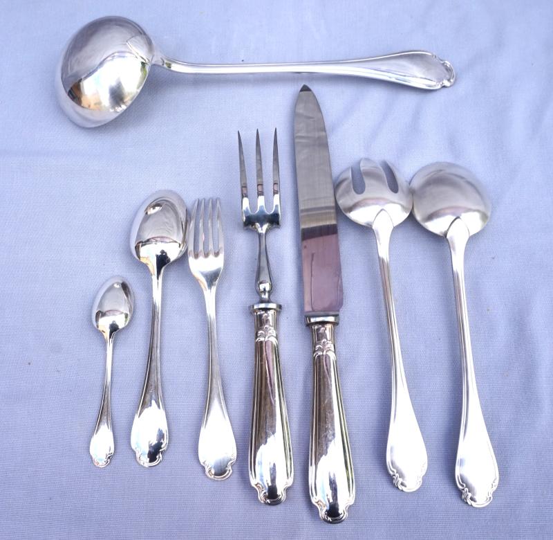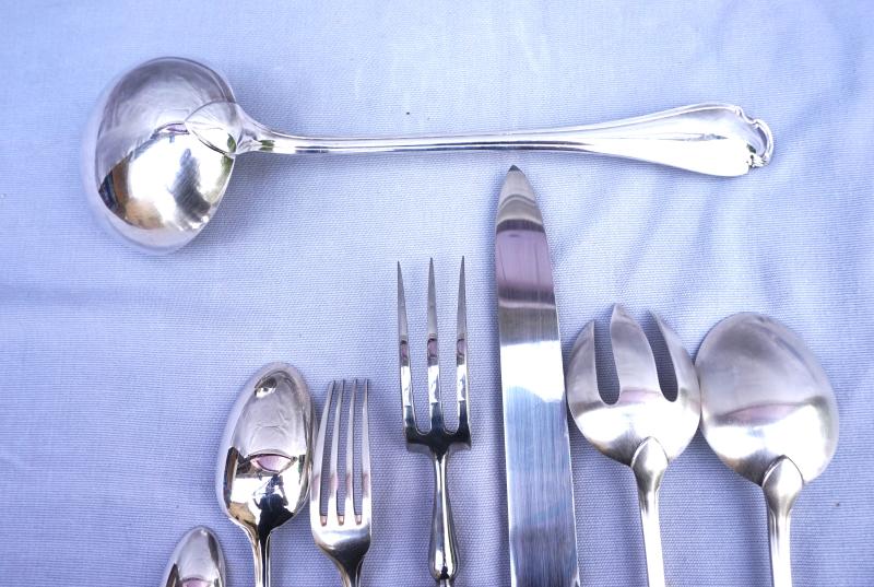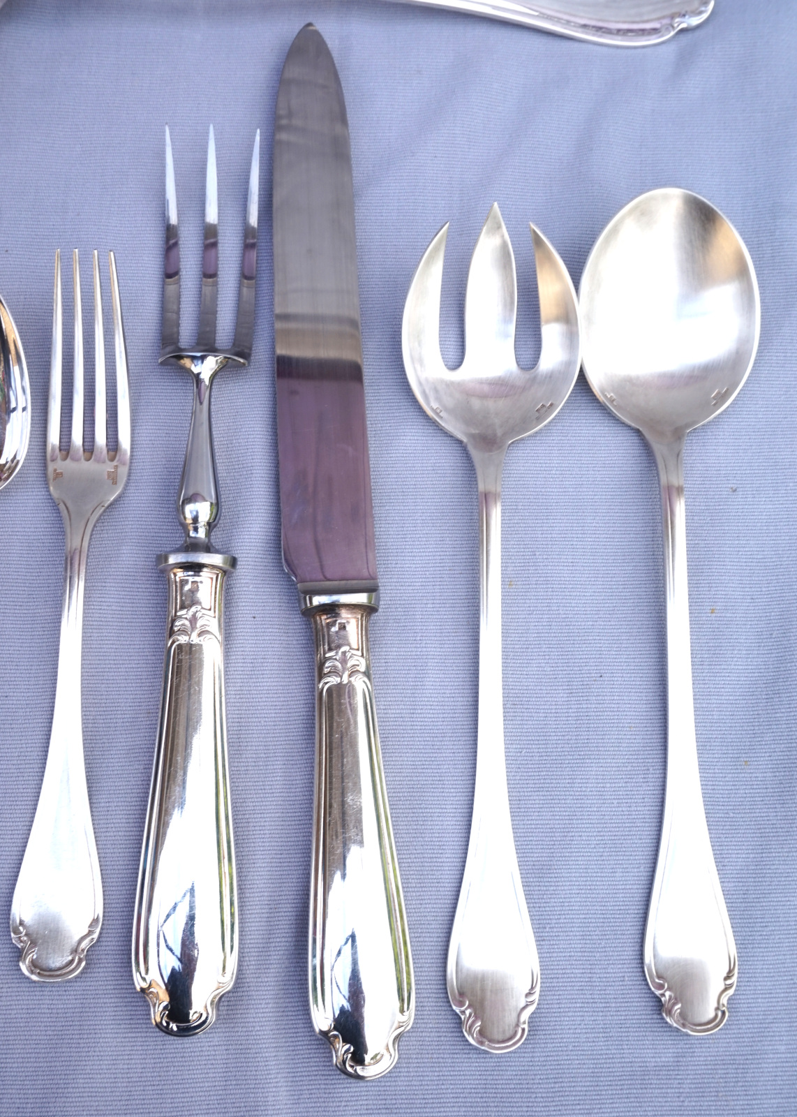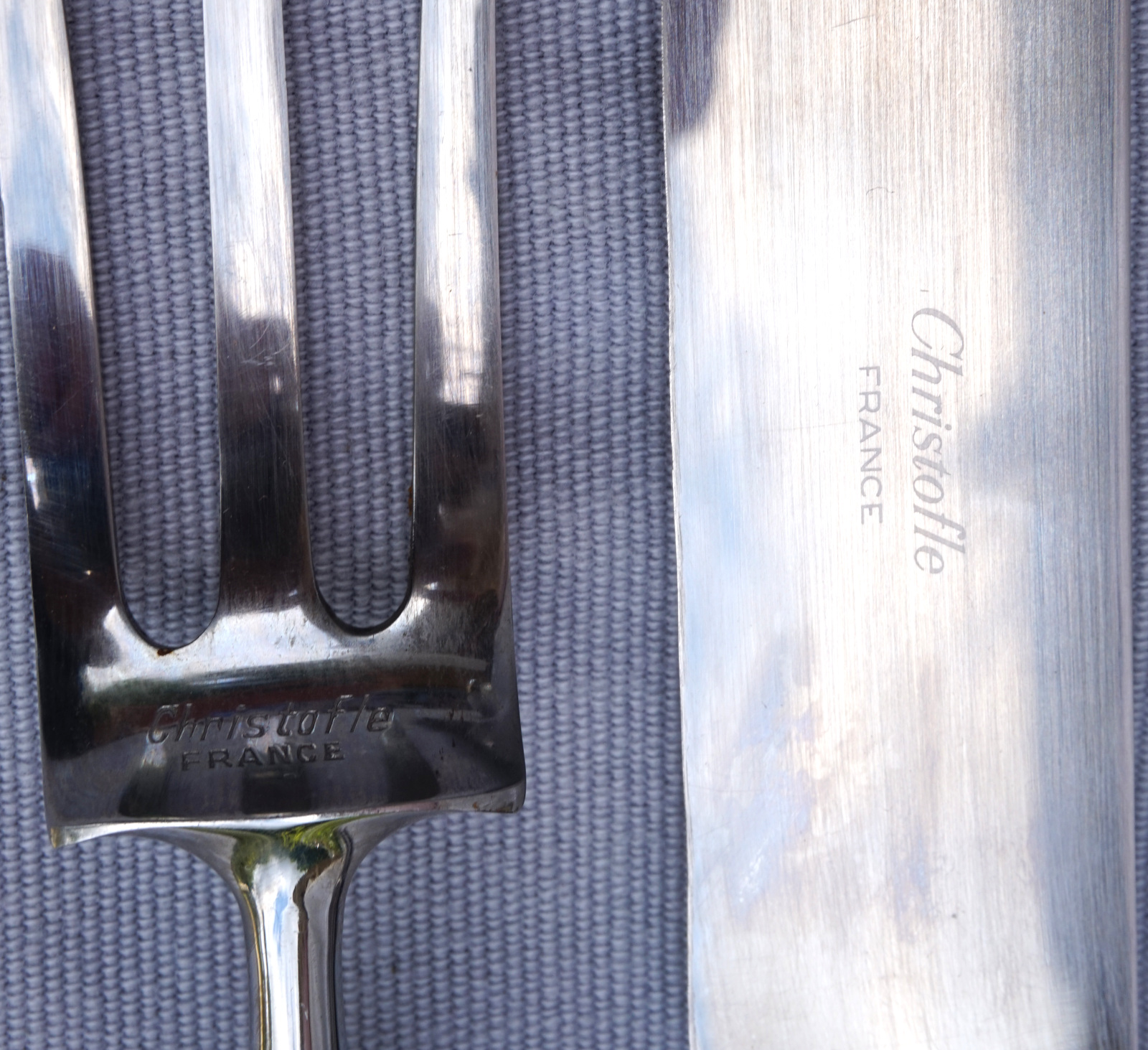 French silverplate Pompadour pattern 41 pieces flatware with 12 dinner forks and spoon 8 1/8" length, 12 dessert spoons 5 1/4" length, 1 laddle, 12 1/2" length, 1 salad serving set (fork 9 1/2"and spoon 9 5/8" length) and 1 carving serving set ( fork 10 5/8"and knife 12 3/4" length) made by Christofle. All the pieces are hallmarked, they come with original boxes. Beautiful condition, many pieces are unused.