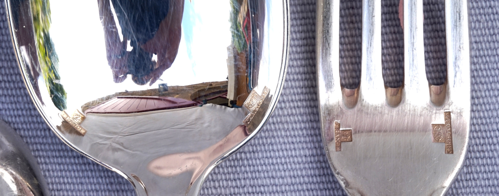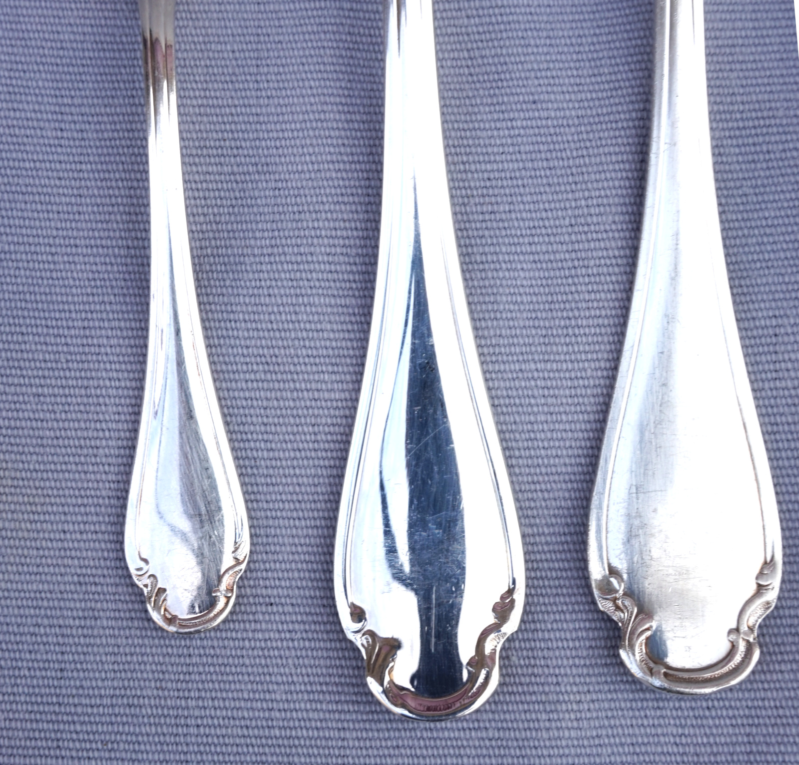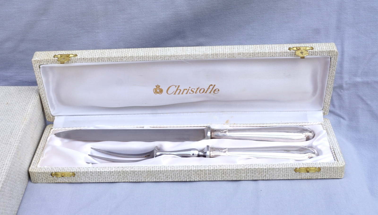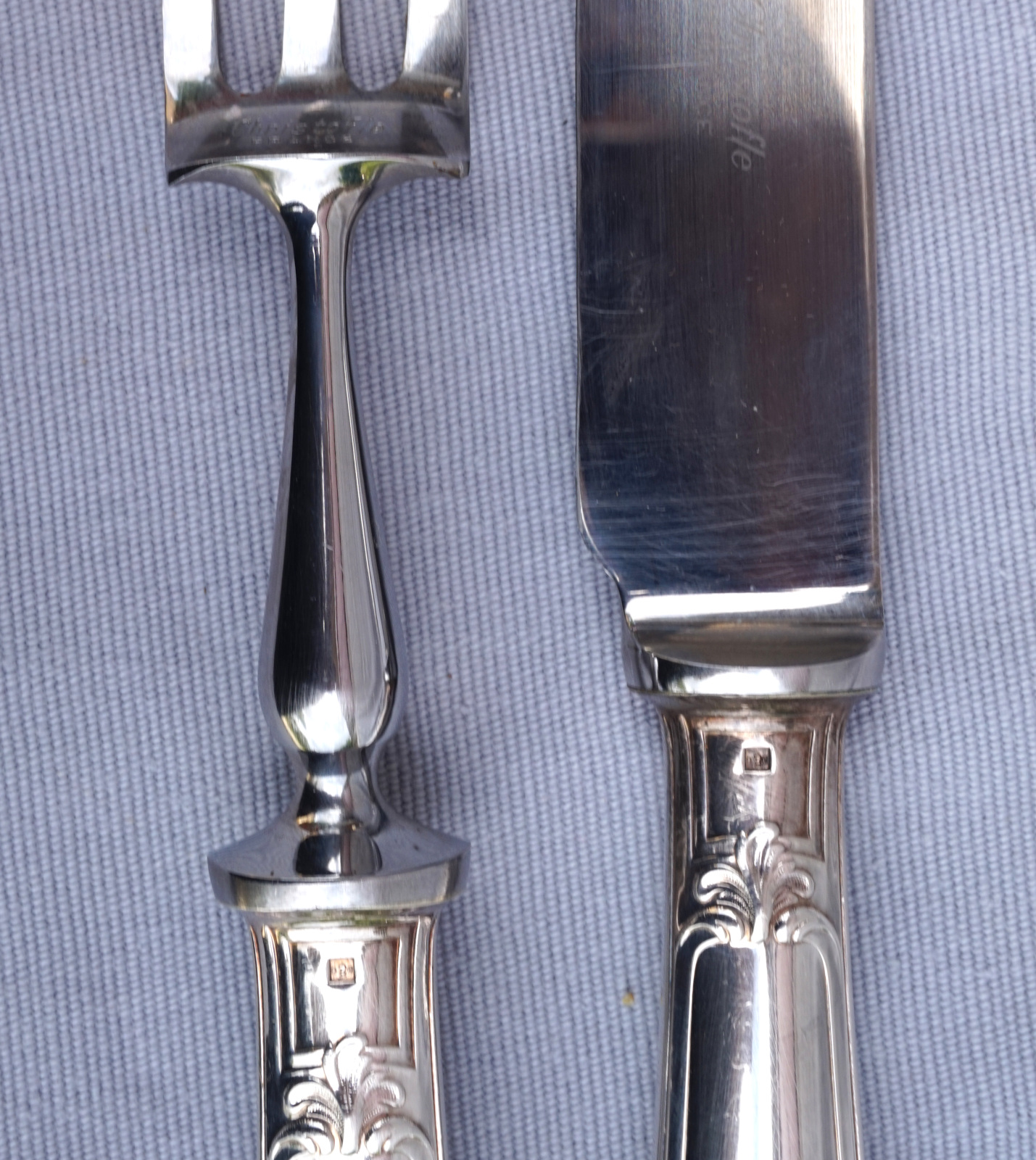 French silverplate Pompadour pattern 41 pieces flatware with 12 dinner forks and spoon 8 1/8" length, 12 dessert spoons 5 1/4" length, 1 laddle, 12 1/2" length, 1 salad serving set (fork 9 1/2"and spoon 9 5/8" length) and 1 carving serving set ( fork 10 5/8"and knife 12 3/4" length) made by Christofle. All the pieces are hallmarked, they come with original boxes. Beautiful condition, many pieces are unused.