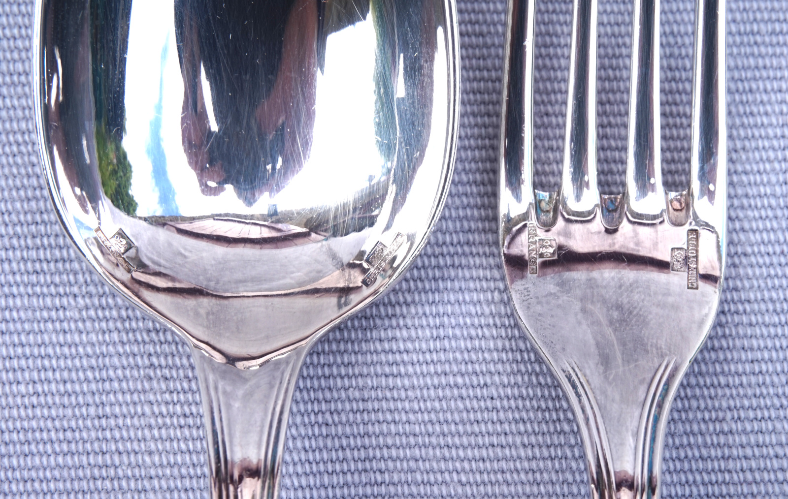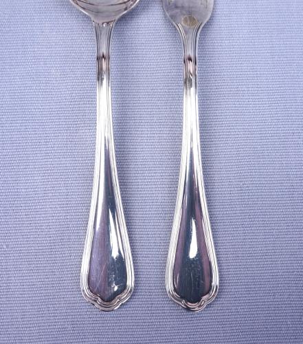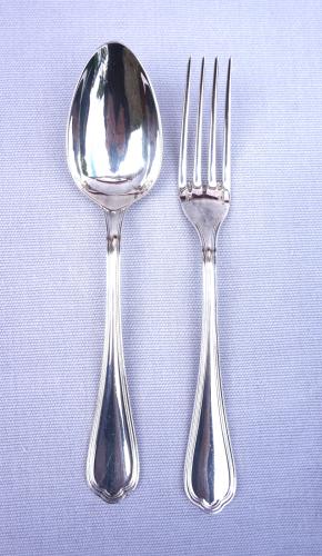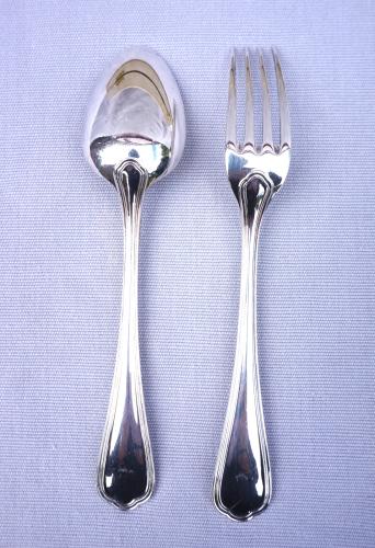 French silver plated youth chidren flatware set Spatours model made by Christofle. All the pieces are hallmarked. 6 3/4" (17.2cm) length for the fork and the spoon. Beautiful condition, the box has a few small rust stains.