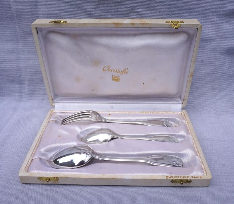 Coffret cadeau pour enfant , cuillère fourchette et cuillère dessert modèle Vendôme en métal argenté. Toutes les pièces sont estampillées Christofle. Longueur pour la cuillère et fouchette 17.2cm, la cuillère dessert 13.5cm. Très bel état, la cuillère dessert a été utilisée, le coffret est un peu usé.