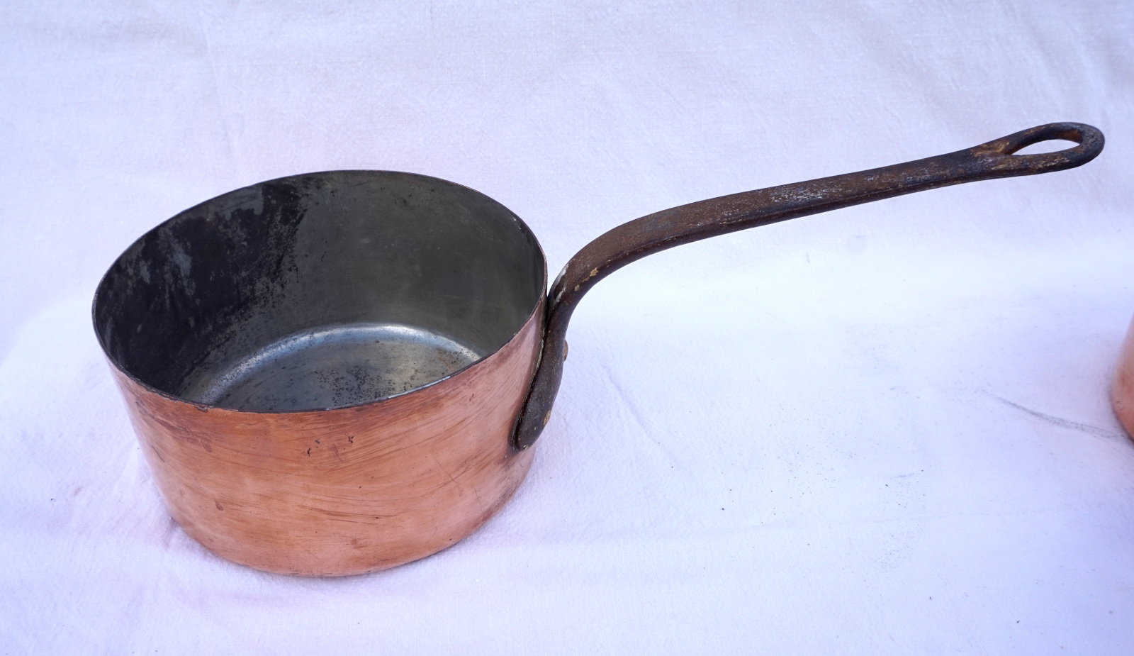 French cookware tinned copper sauce pan with iron handle and copper rivets made during the 1900's. 6 3/4" (17.7cm) diameter, 14 3/4" (37.5cm) width with handle, 3 5/8" (9.2cm) height, thickness 1mm, weight 2.41lb (953 grams). Good condition, small stains.