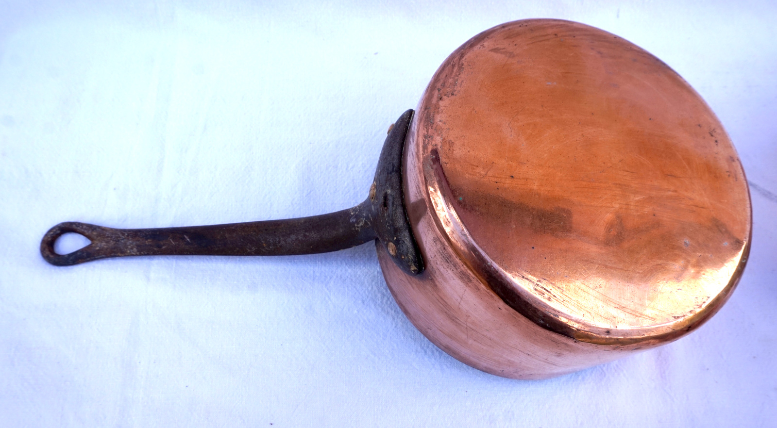 Casserole en cuivre étamé à manche fer et rivets cuivre, vers 1900. Diamètre 17.7 cm, hauteur 9.2 cm, largeur 37.5 cm, poids 953 gr, épaisseur 1 mm. Bel état, petites tâches.