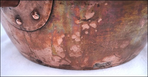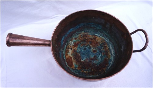 Casserole, bassine, en cuivre monté à créneaux, pour le travail du sucre, XIXe siècle. Diamètre 28 cm, largeur avec les anses 48 cm, hauteur 14 cm, poids 3.2kg. Bel état.