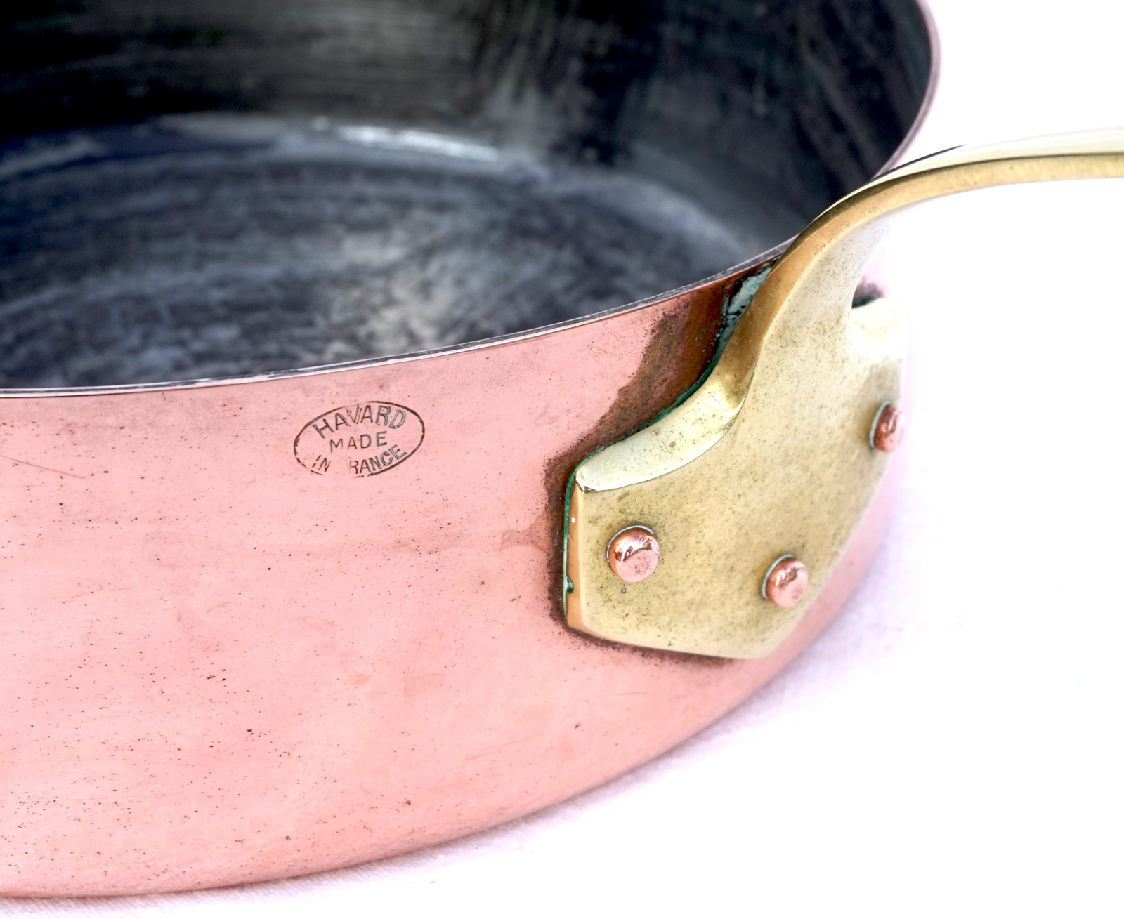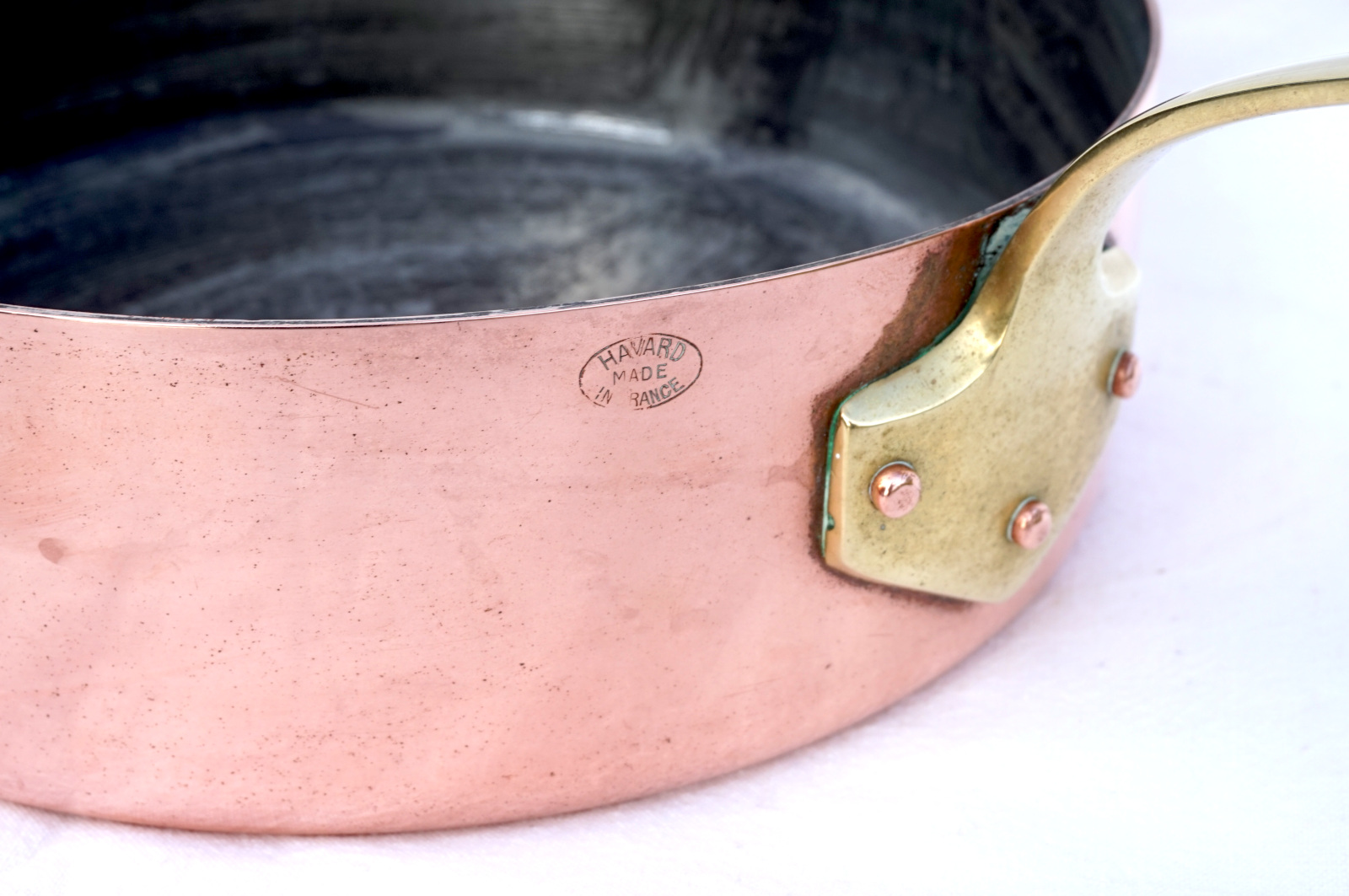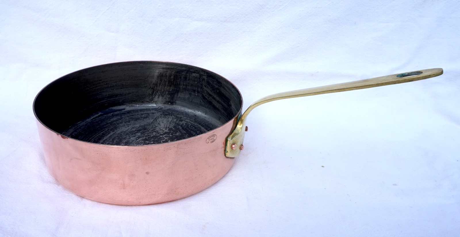 French cookware hammered,the bottom, tined copper with brass handle saute frying pan made by Havard France. It's stamped on the side. 9" (22,8cm) diameter, 2 3/4" (7cm) height, 16" (40.6cm) length with the handle, thickness 2mm, weight 2lb 12oz (1.245 kilograms). Perfect condition.