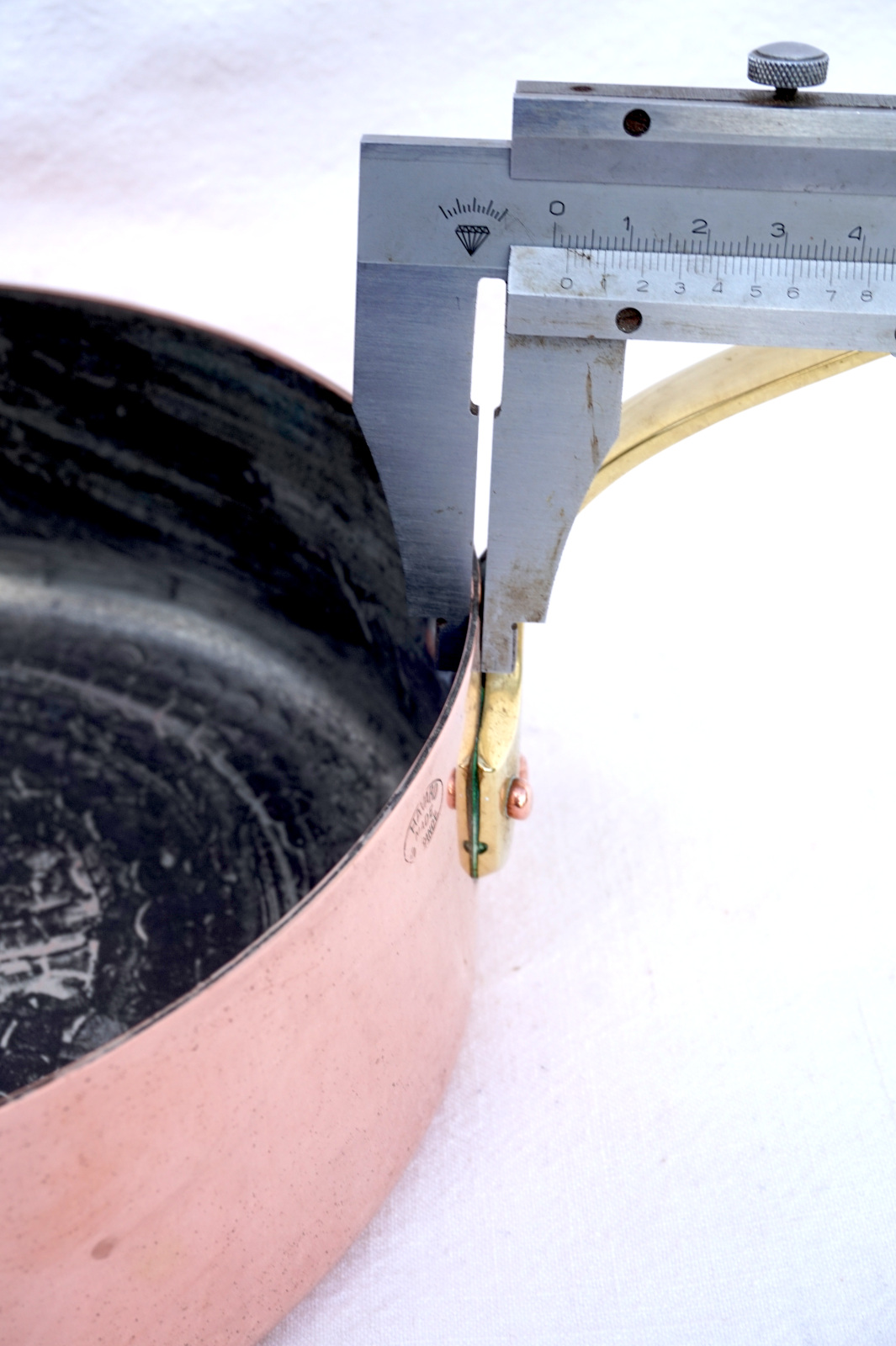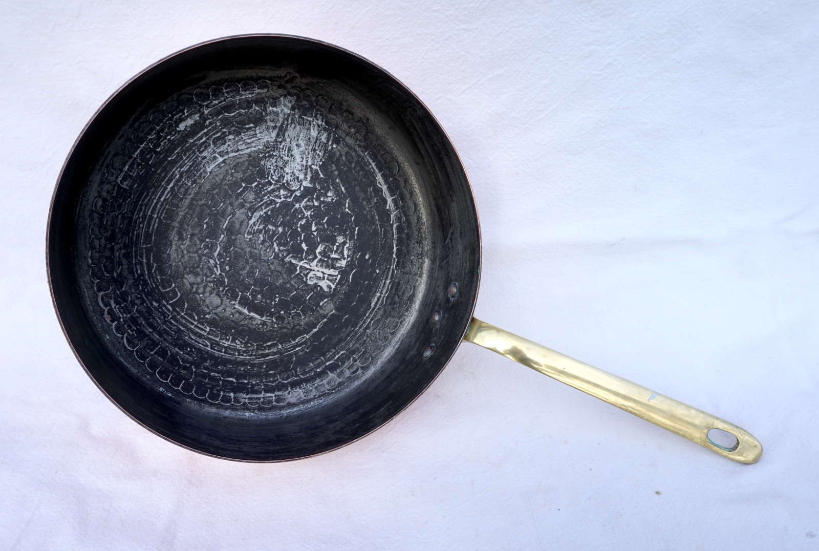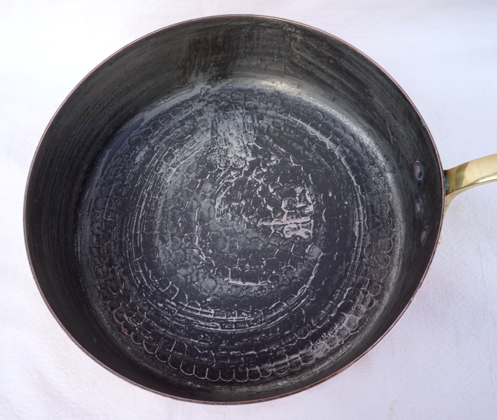 French cookware hammered,the bottom, tined copper with brass handle saute frying pan made by Havard France. It's stamped on the side. 9" (22,8cm) diameter, 2 3/4" (7cm) height, 16" (40.6cm) length with the handle, thickness 2mm, weight 2lb 12oz (1.245 kilograms). Perfect condition.