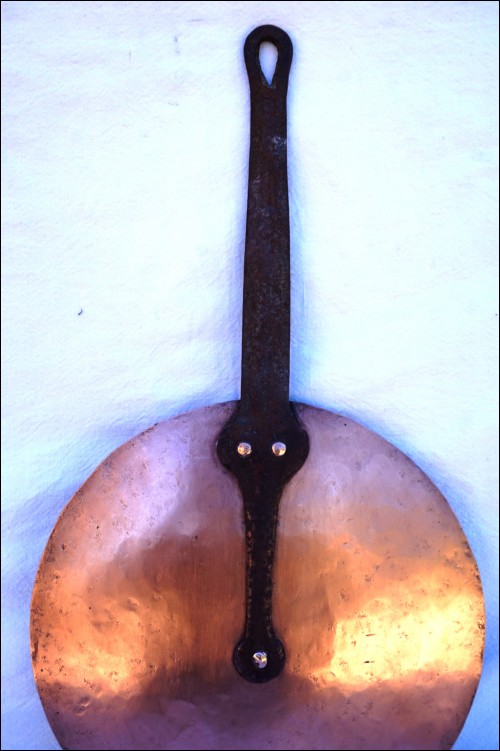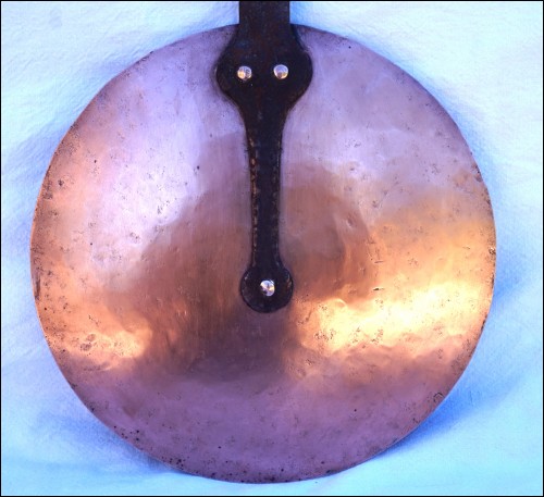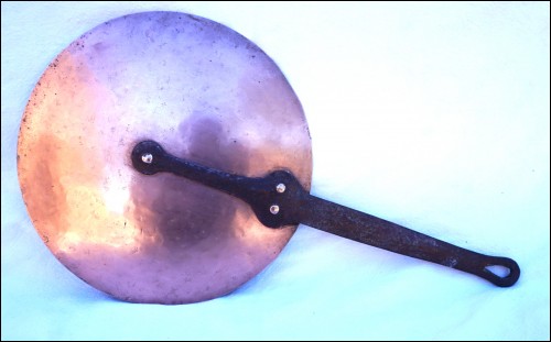 Couvercle en cuivre étamé à manche fer et rives cuivres. Diamètre 24.7cm, longueur avec le manche 45.8cm, poids 642gr. Très bel état.