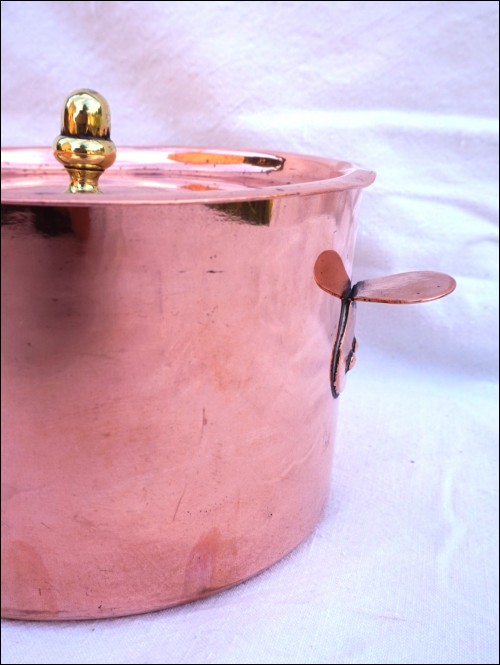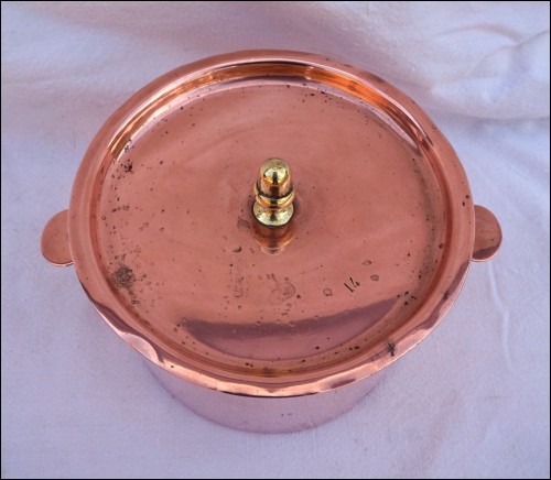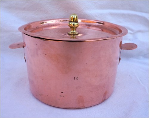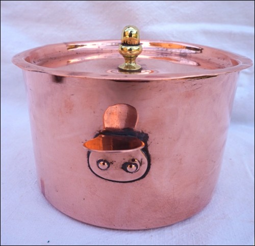 French cookware tin lined copper souffle cake jello lidded pan pot made during the 1910's. They are stamped 14. 5 3/4" (14.5cm) diameter, 8 1/4" (21cm) width, 4 1/4" (11cm) height, weight 1lb 8oz (681 grams). Good condition with beautiful patina as shown by the following pictures.