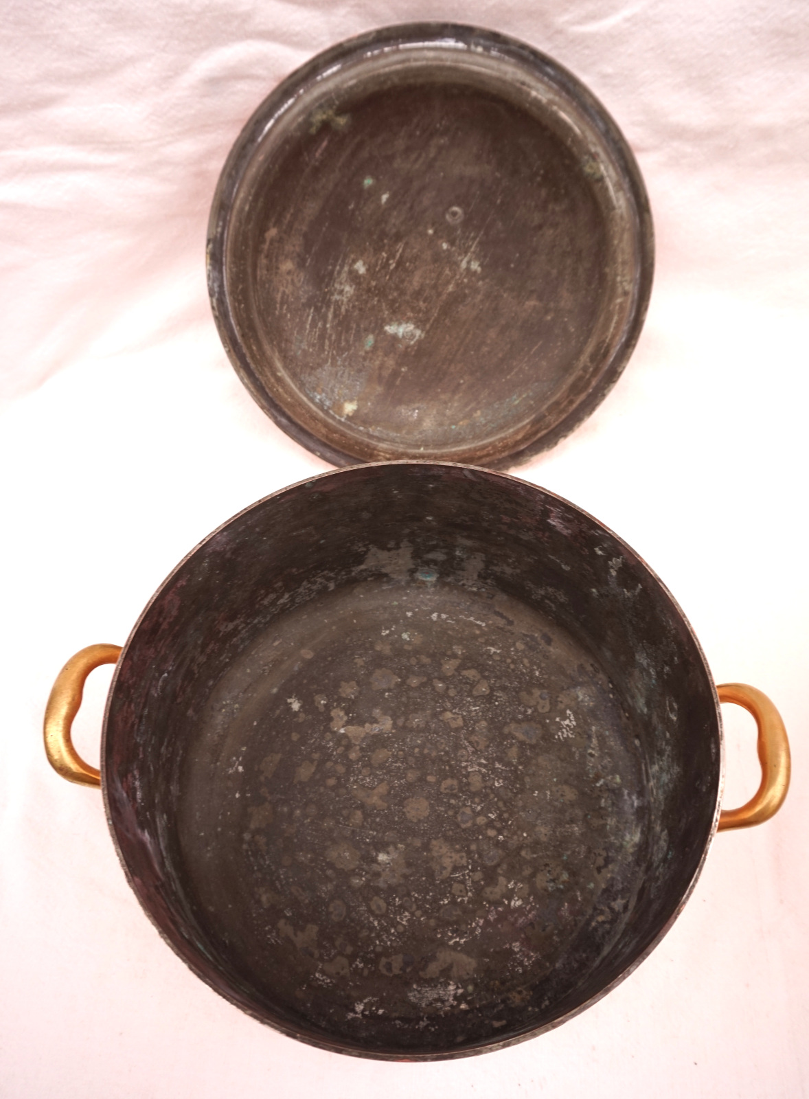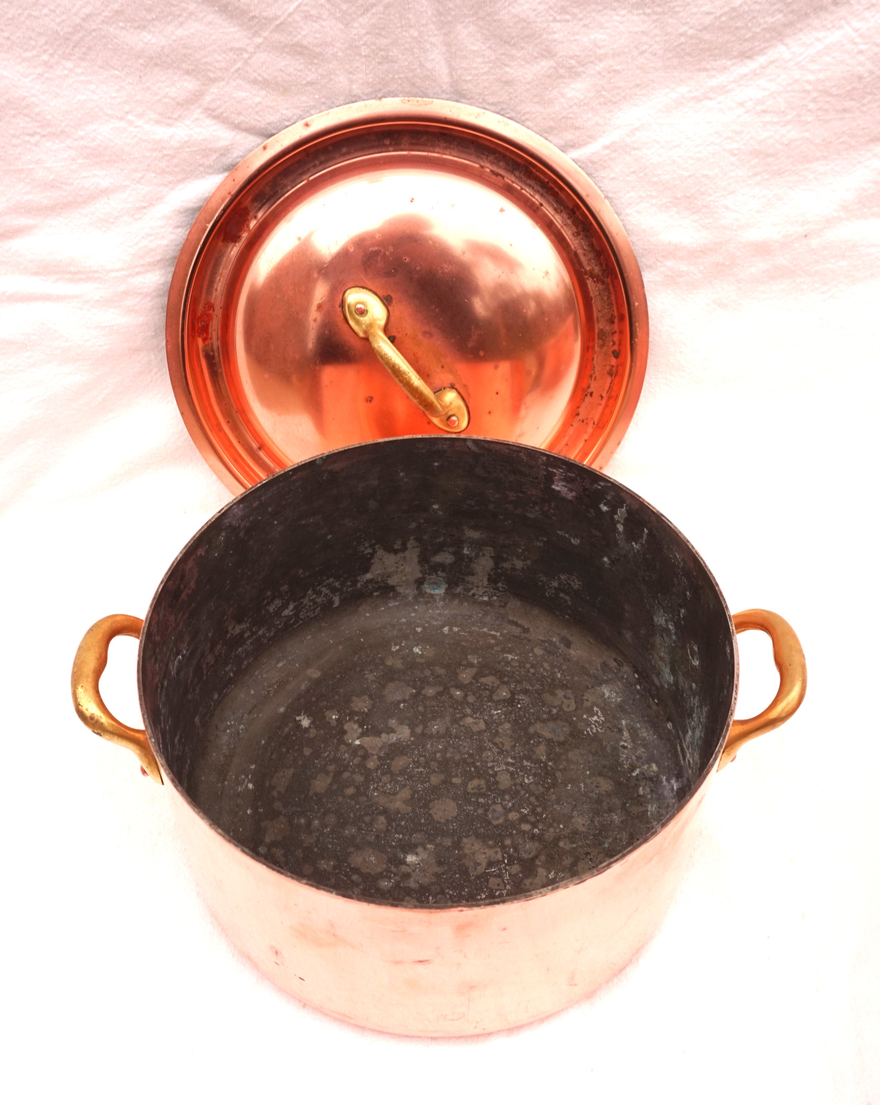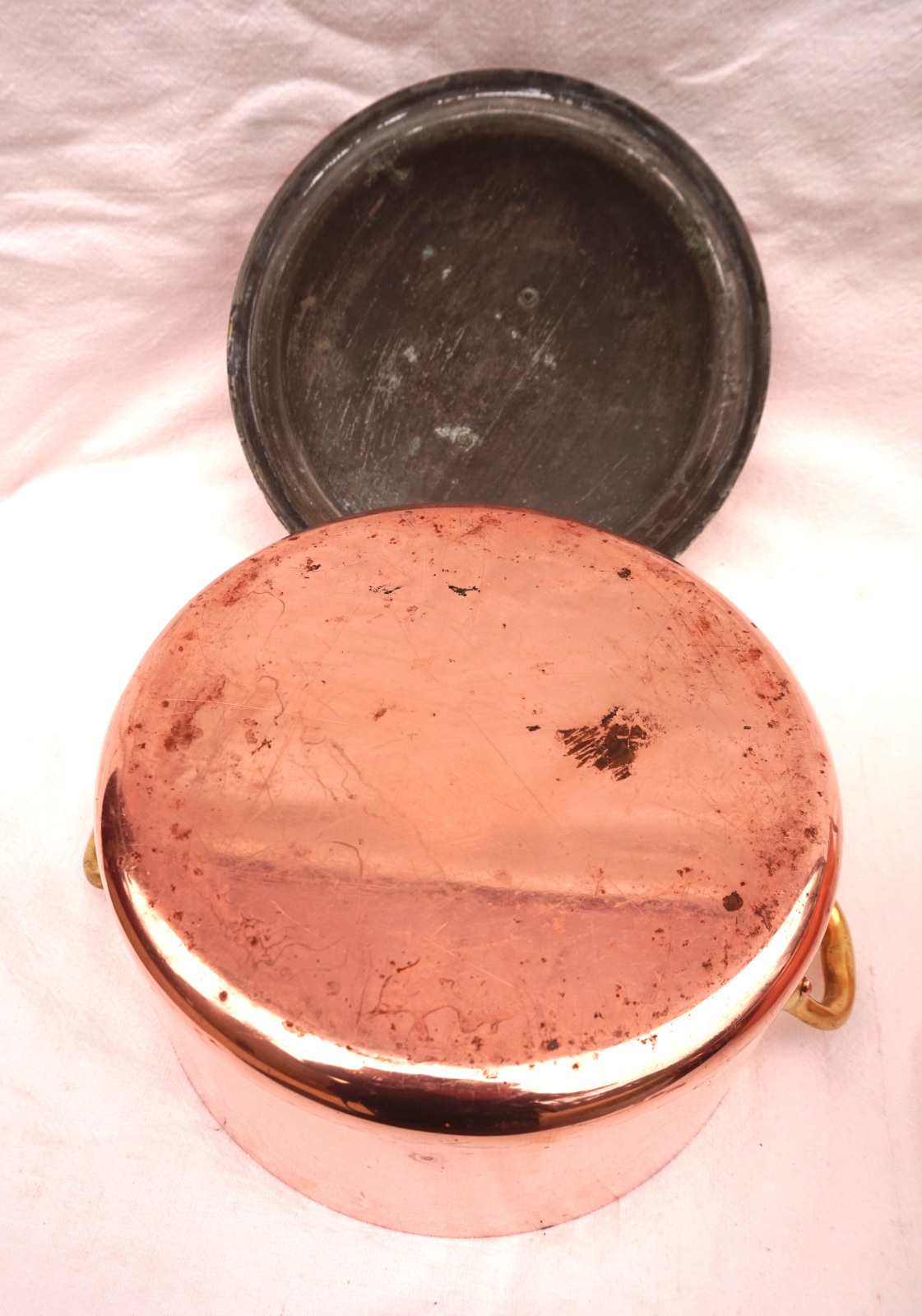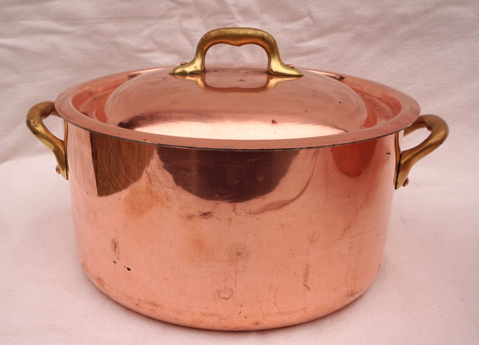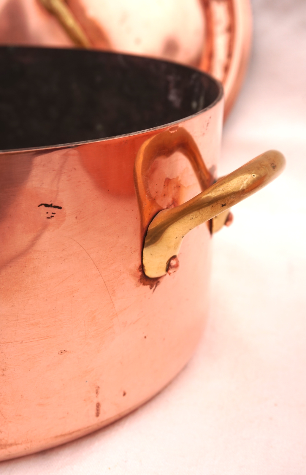 French cookware tined copper cocotte with brass handles made in Normandy during the mid-century. It's stamped Made in France. 5 1/2" (14cm) height, 10 1/2" (26.6cm) width with handles, 8" (20.3cm) diameter, depth 2mm, weight 4lb 6.40oz (1.996kilogrms), capacity 3.7qt (3.5 liters). Good condition a few stains inside and outside as shown by the following pictures.