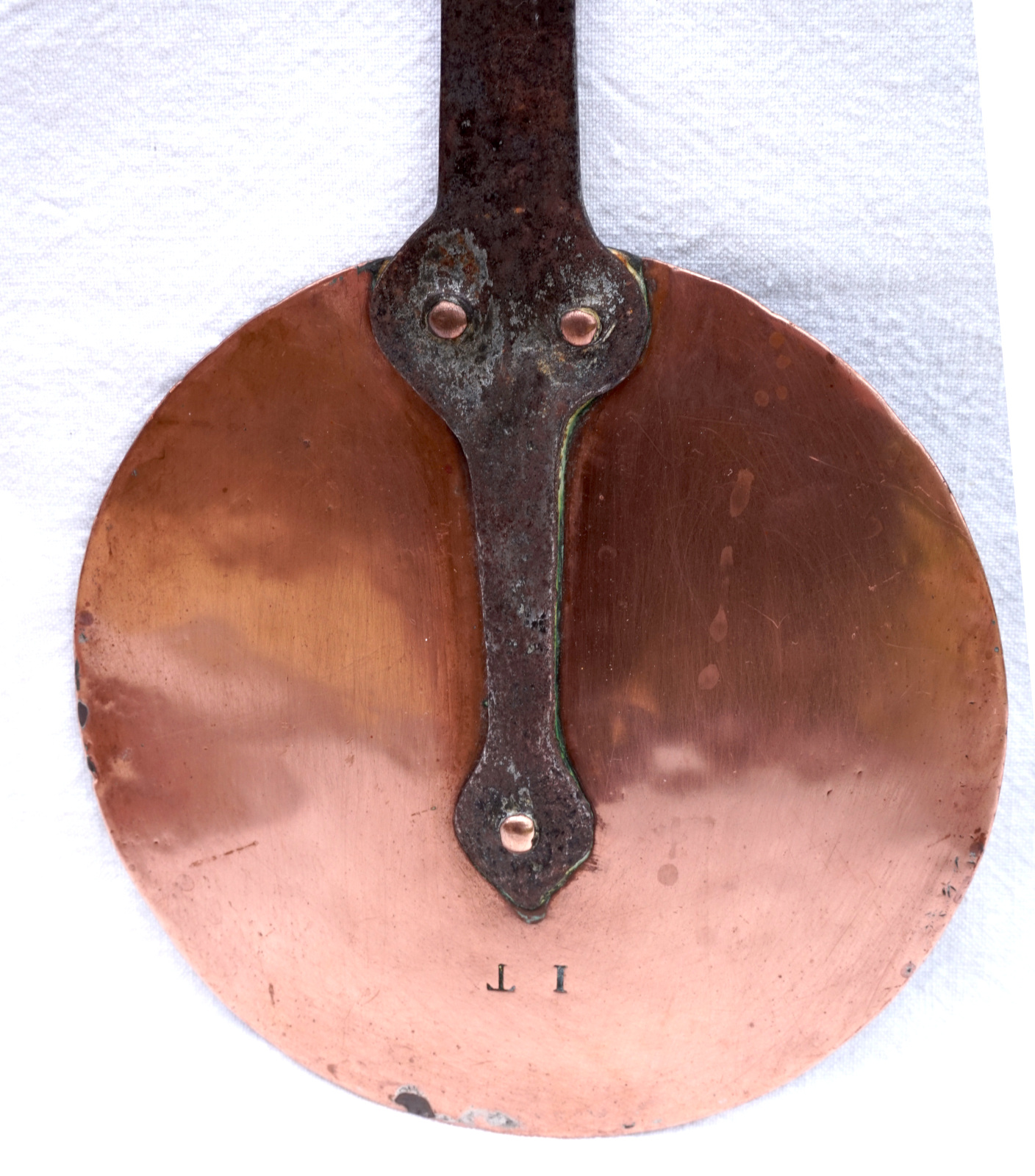 French cookware tined copper lid with wrought iron handle and IT monogram made late 19th century. 5 3/4" (14.5cm) diameter, 9 1/4" (23.7cm) length with handle. Perfect condition.